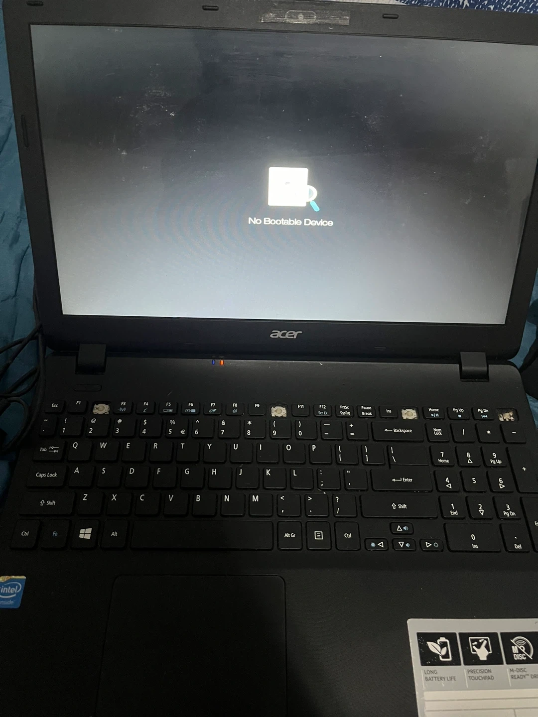 77Selling a used Acer laptop. It comes with a charger. Please note that the laptop displays a 'No Bootable Device' message, so it may need a Windows CD To restore it back to default settings, some button keys are missing. but the button still works!