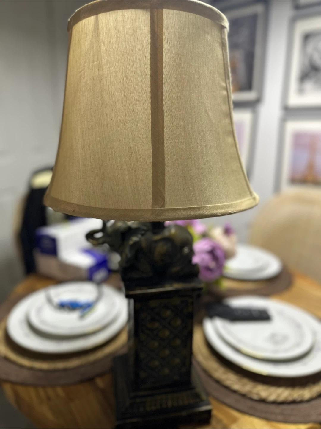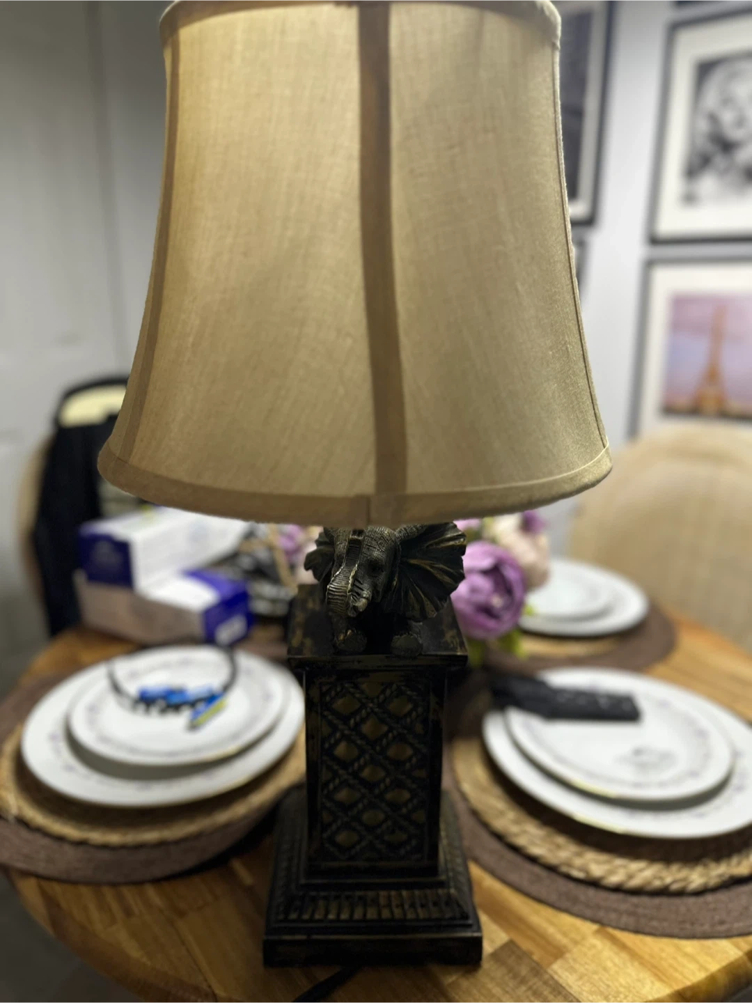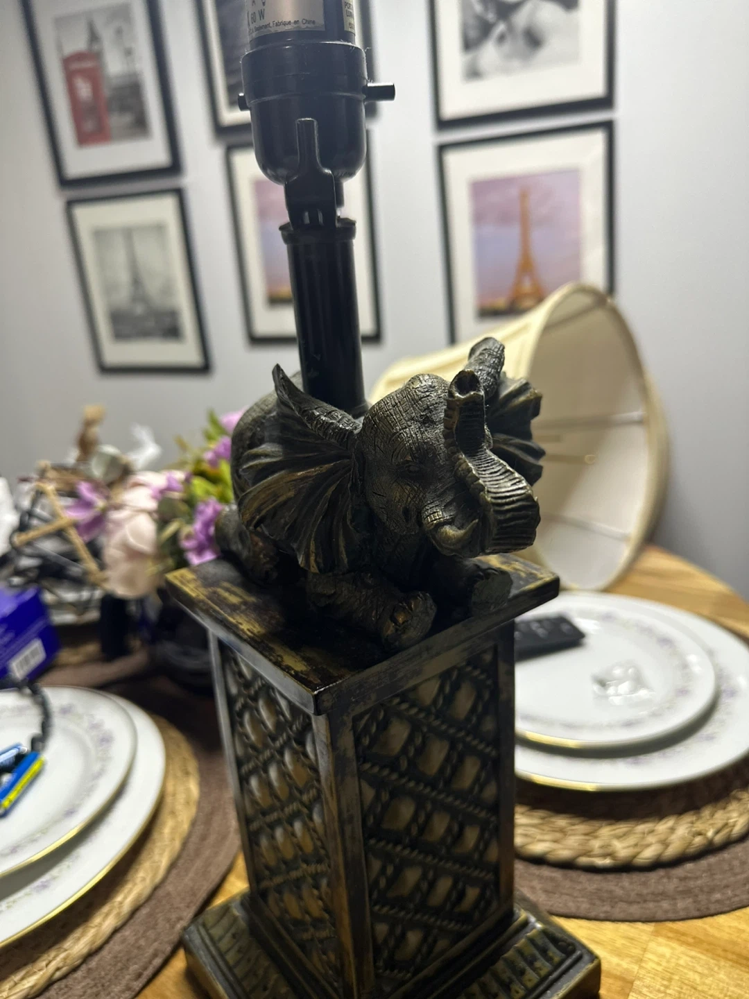 This is a unique accent lamp featuring an elephant design. It would be a great addition to any room! The lamp has a neutral color shade and a detailed base.