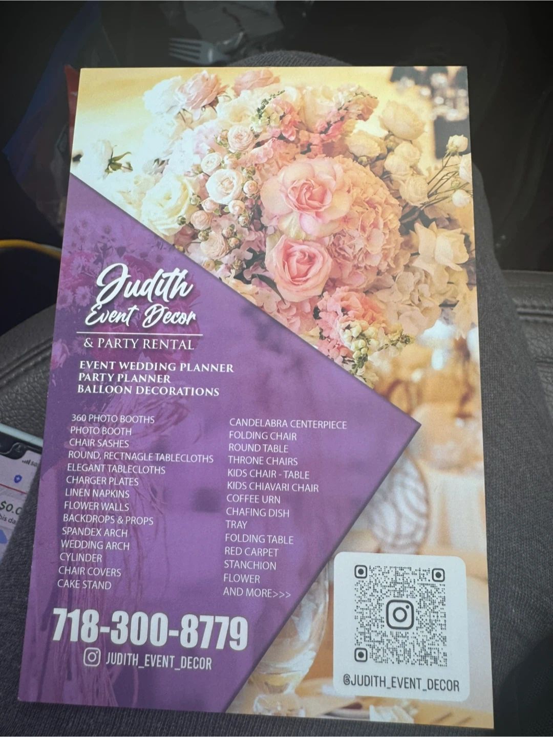 Flyer for Judith Event Decor & Party Rental. Services include event wedding planner, party planner, balloon decorations, photo booths, chair sashes, tablecloths, charger plates, flower walls and more! Contact 718-300-8779 or @judith_event_decor