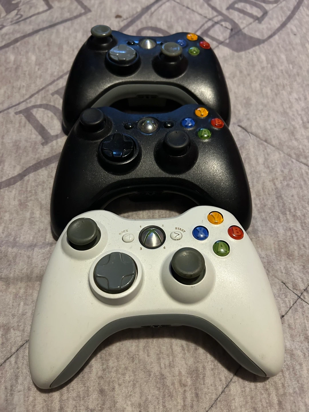 Selling three Xbox 360 controllers! Two are black and one is white. They're used but in good condition and ready for your gaming sessions
