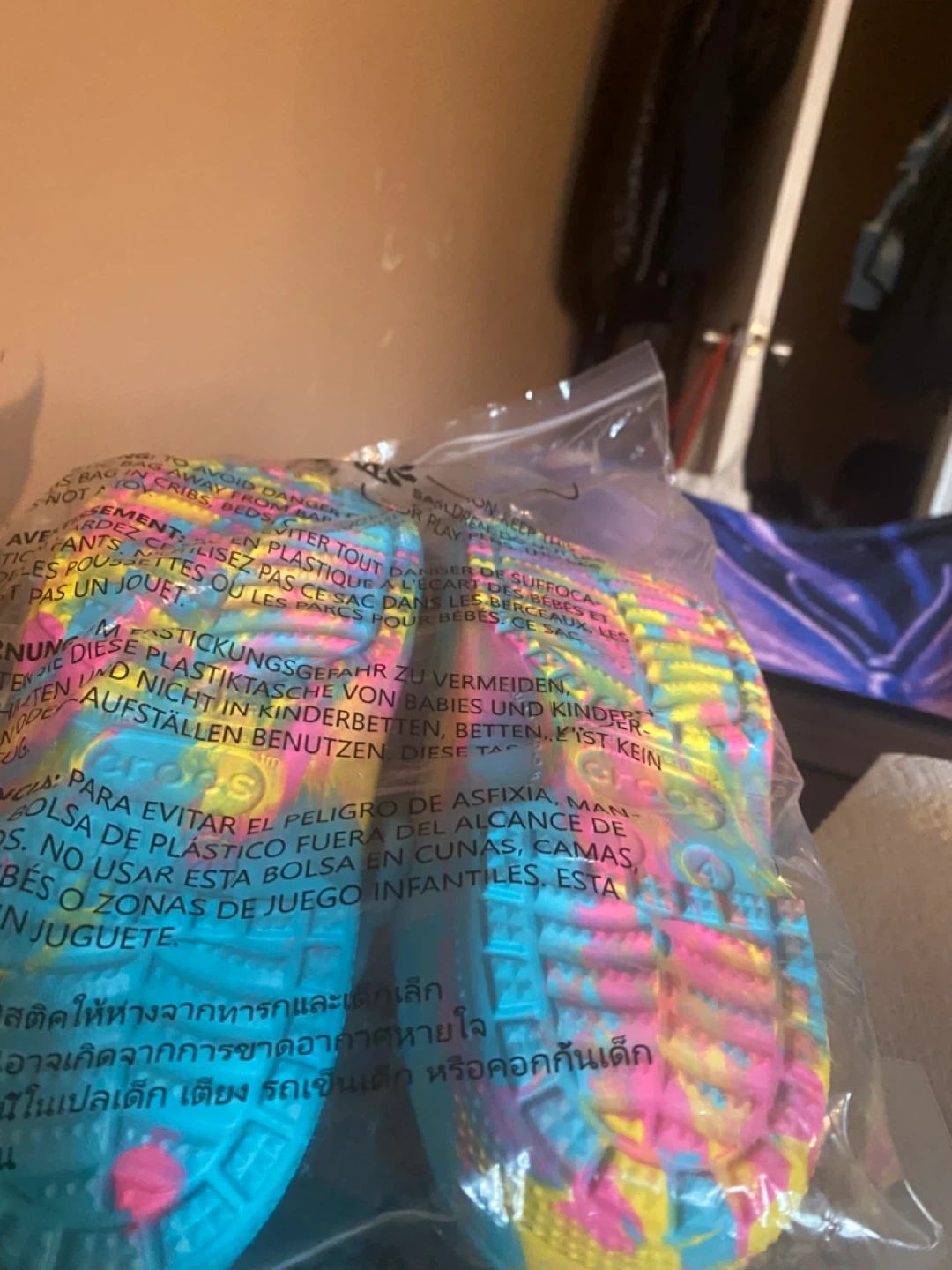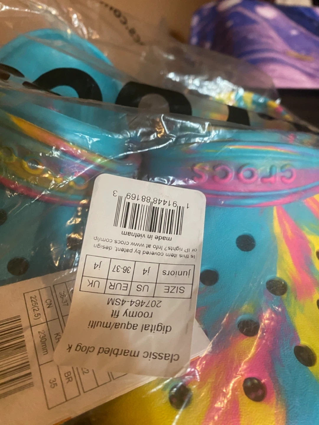 Selling a pair of Crocs Classic Marbled Clog K in Digital Aqua Multi! These are a roomy fit and in size J4 (US size). They're brand new and still in the original packaging