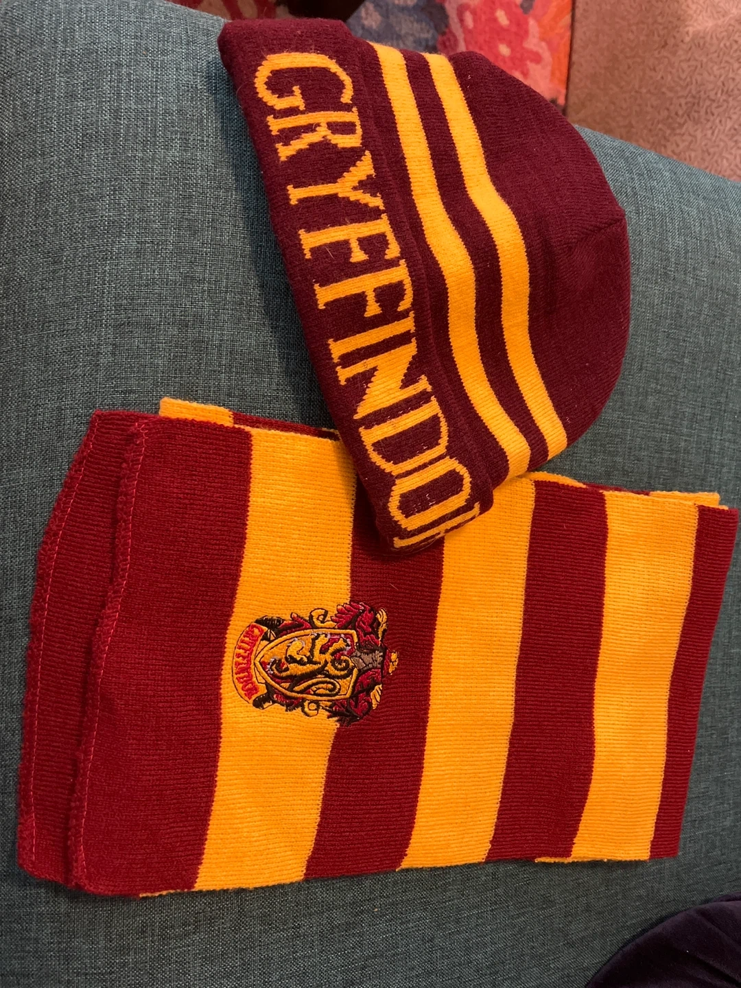 Gryffindor beanie and scarf set from the Harry Potter series. The beanie has the word "Gryffindor" knit into it and the scarf has the Gryffindor crest. Great for any Harry Potter fan!