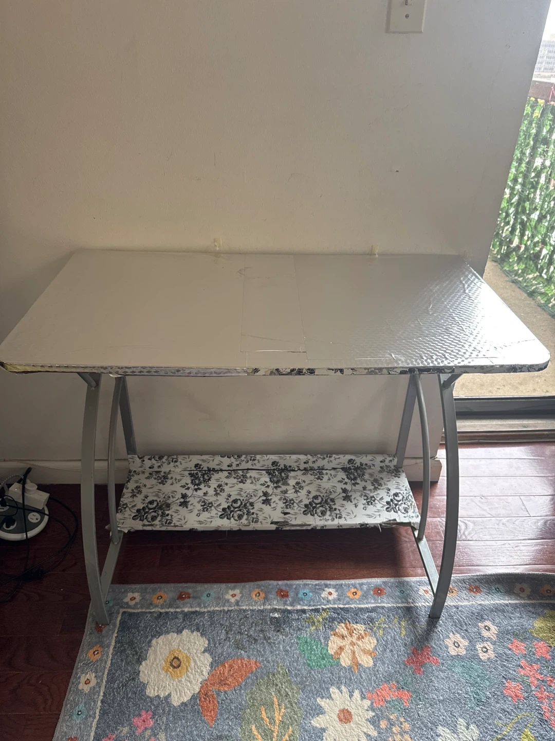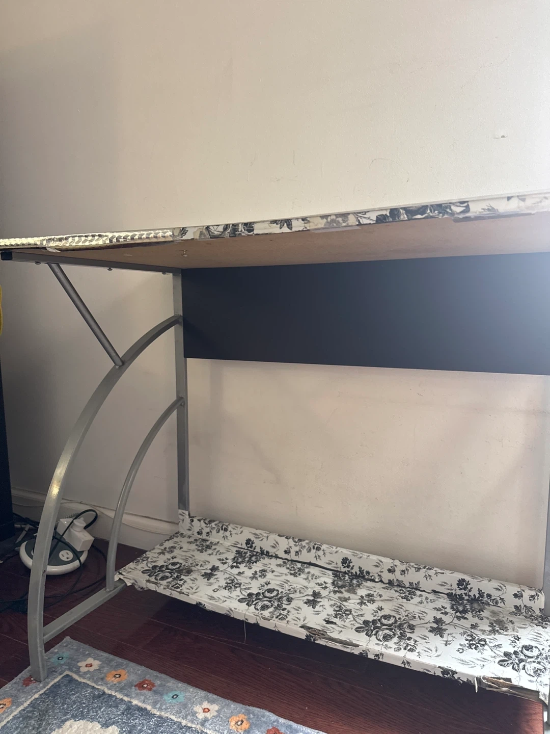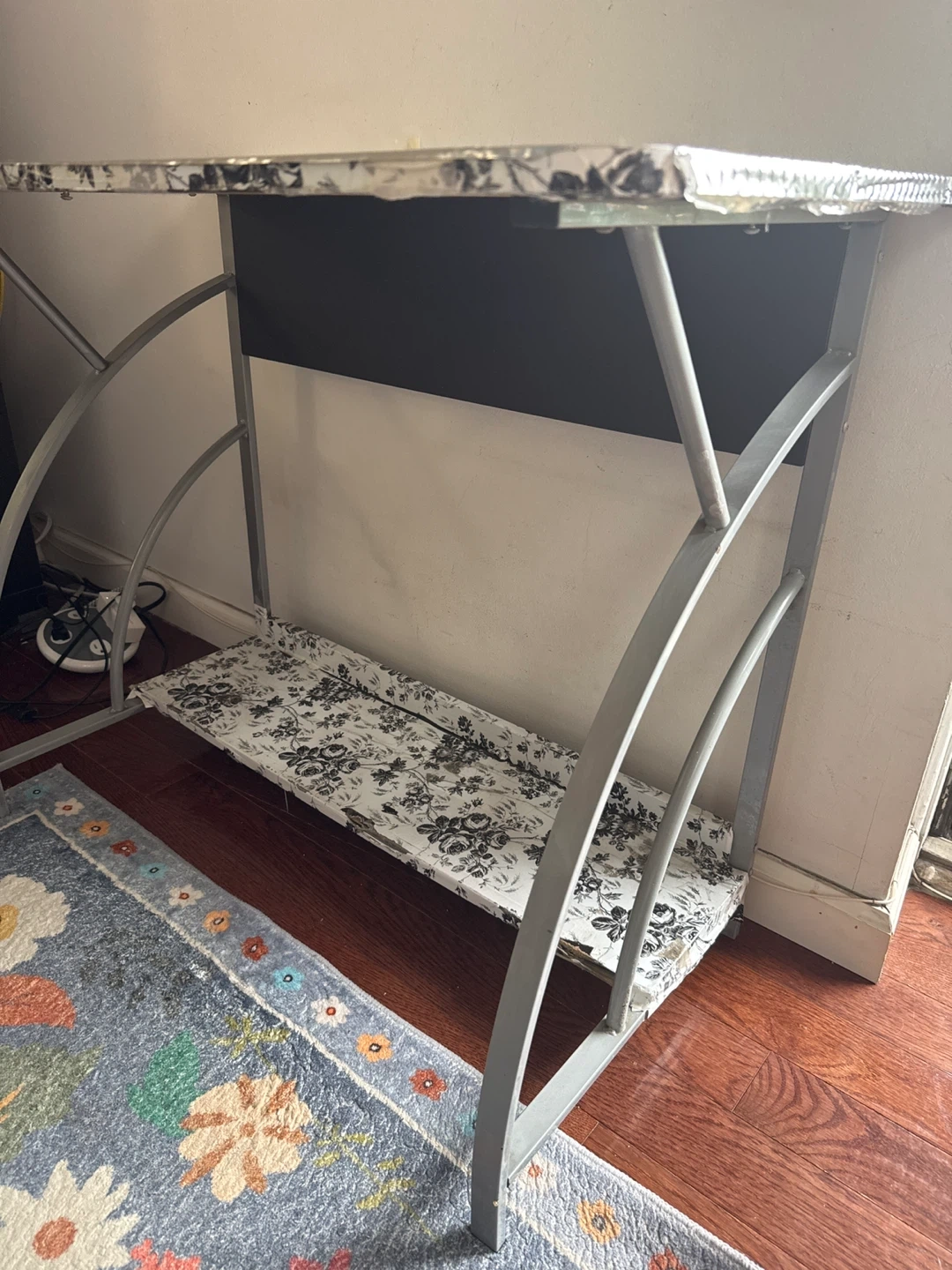 Selling a used desk with a silver metal frame. It has a black panel in the back and a shelf with a floral pattern. There are some signs of wear and tear on the shelf, as shown in the pictures. *****ok for students or who want to use for short time and dispose******* ****look pictures****