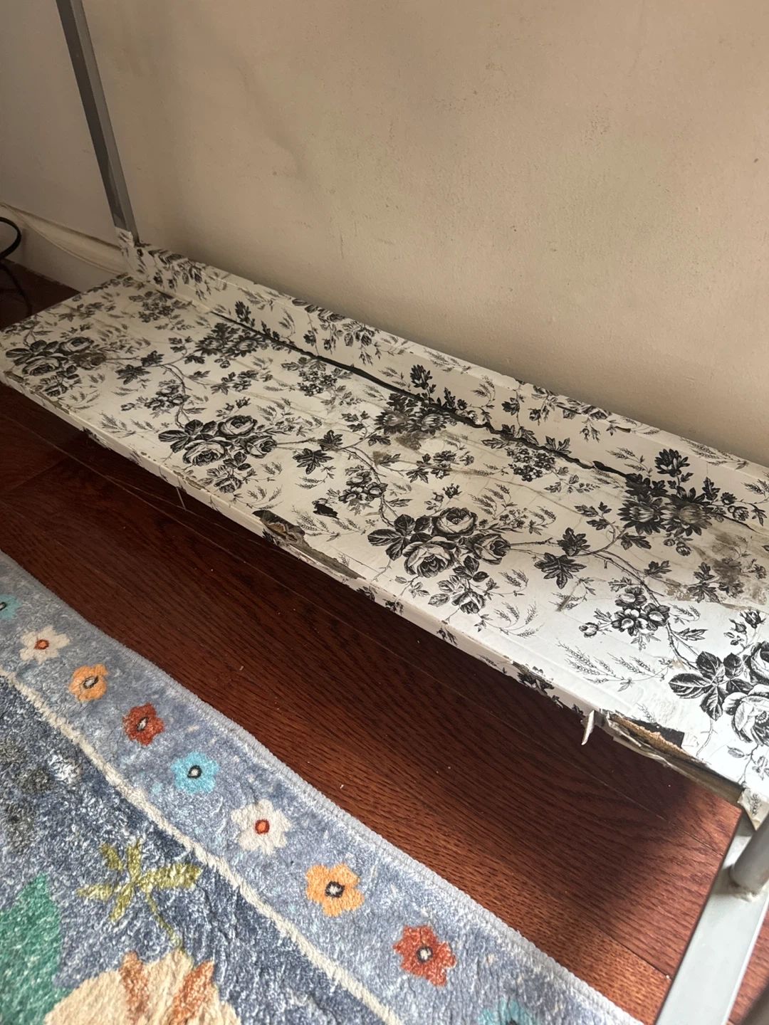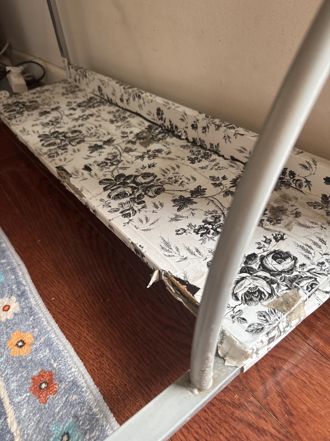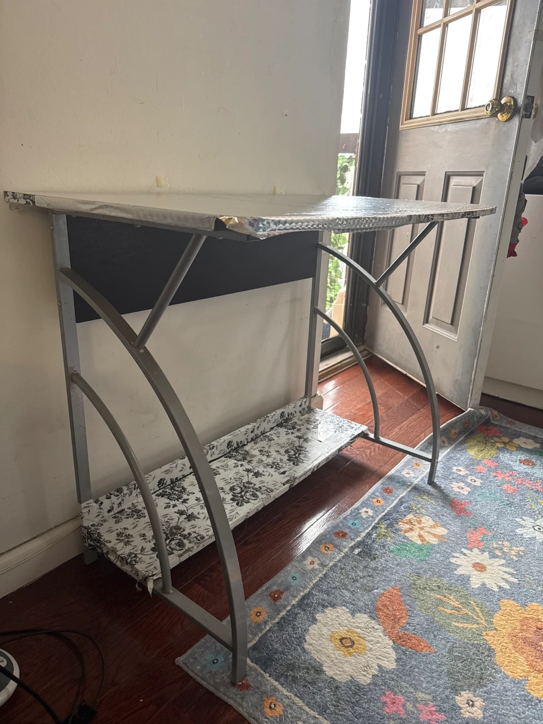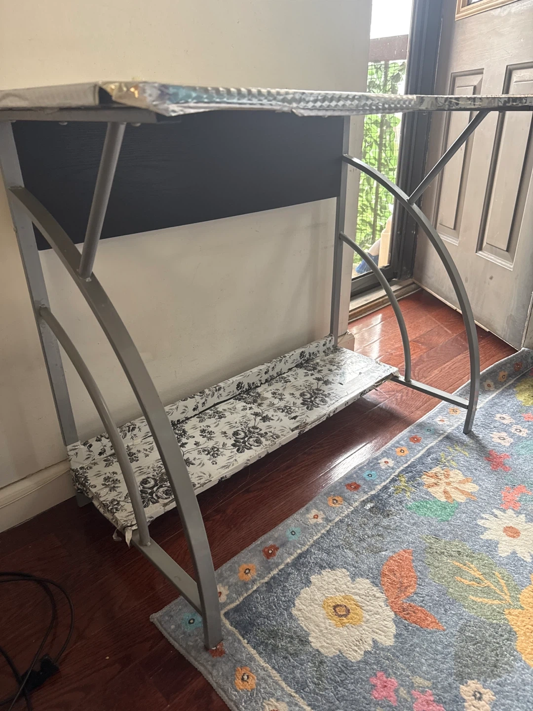Selling a used desk with a silver metal frame. It has a black panel in the back and a shelf with a floral pattern. There are some signs of wear and tear on the shelf, as shown in the pictures. *****ok for students or who want to use for short time and dispose******* ****look pictures****