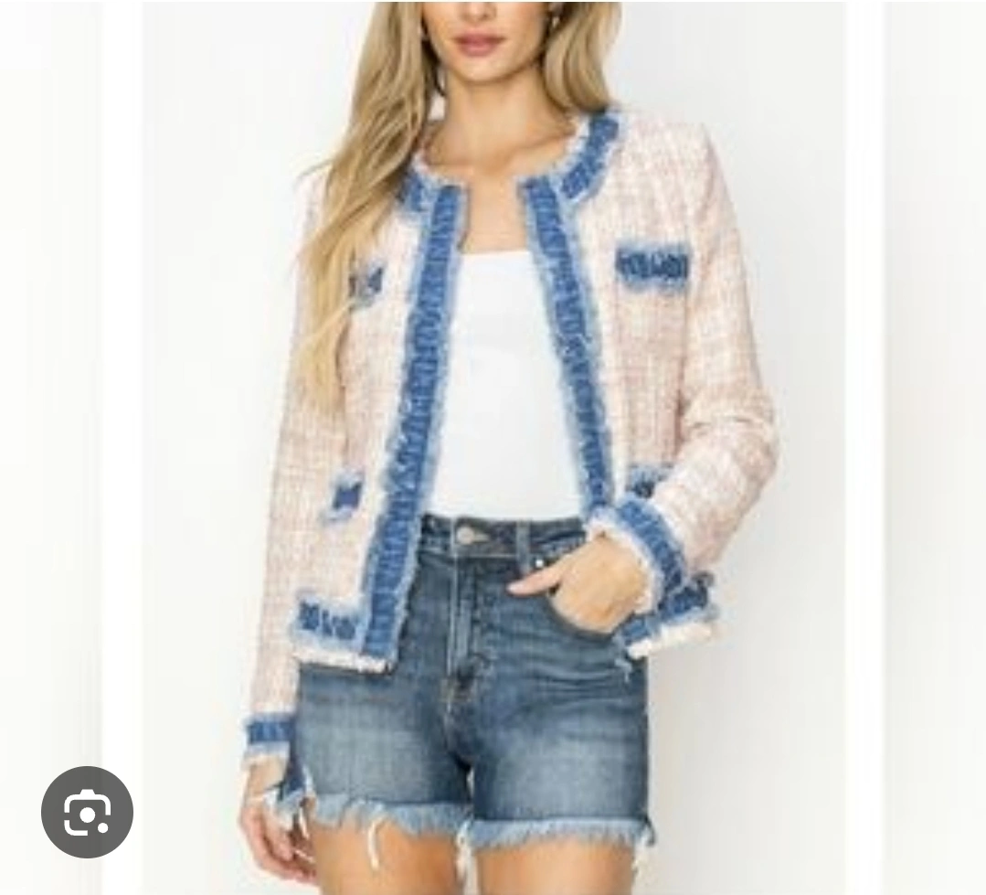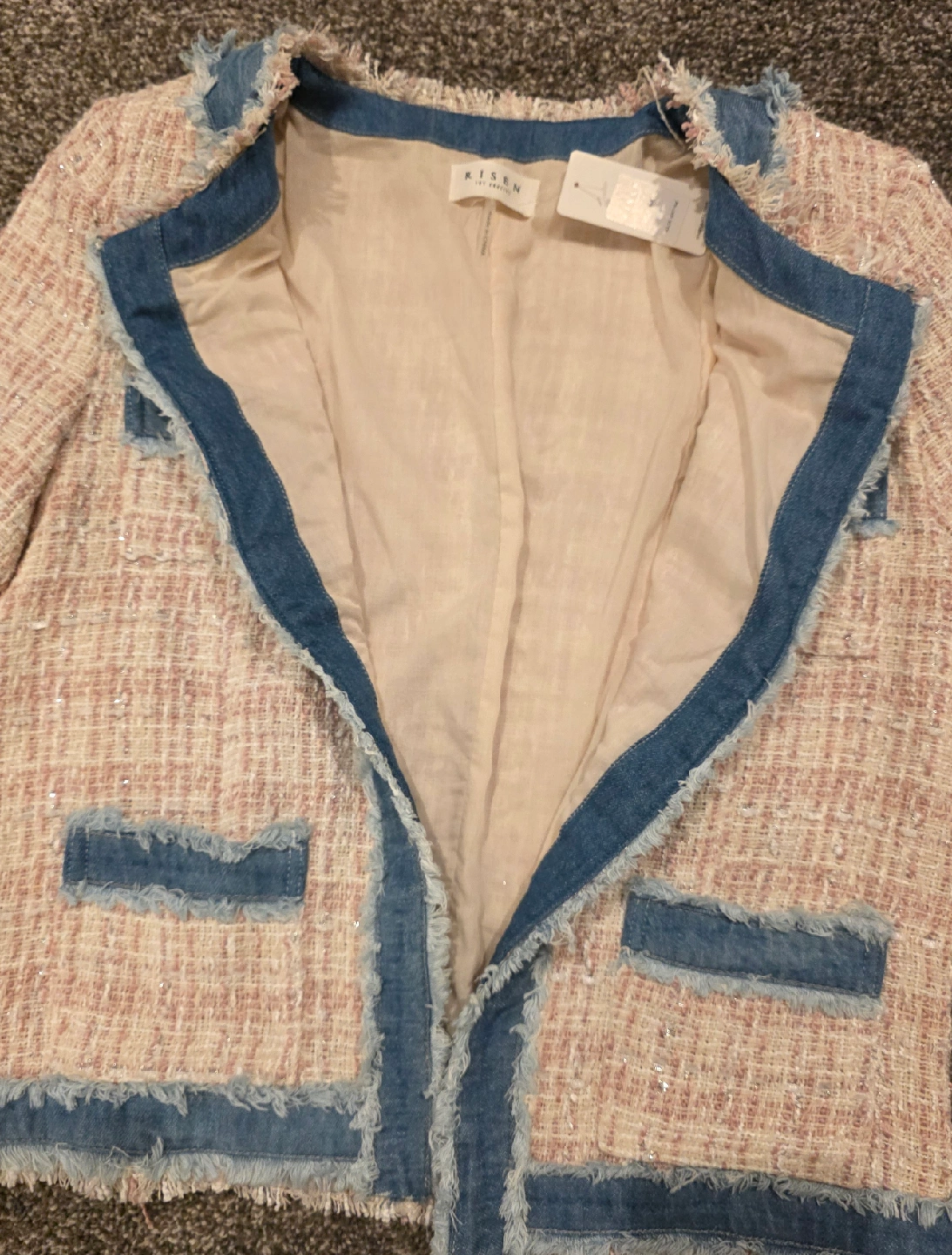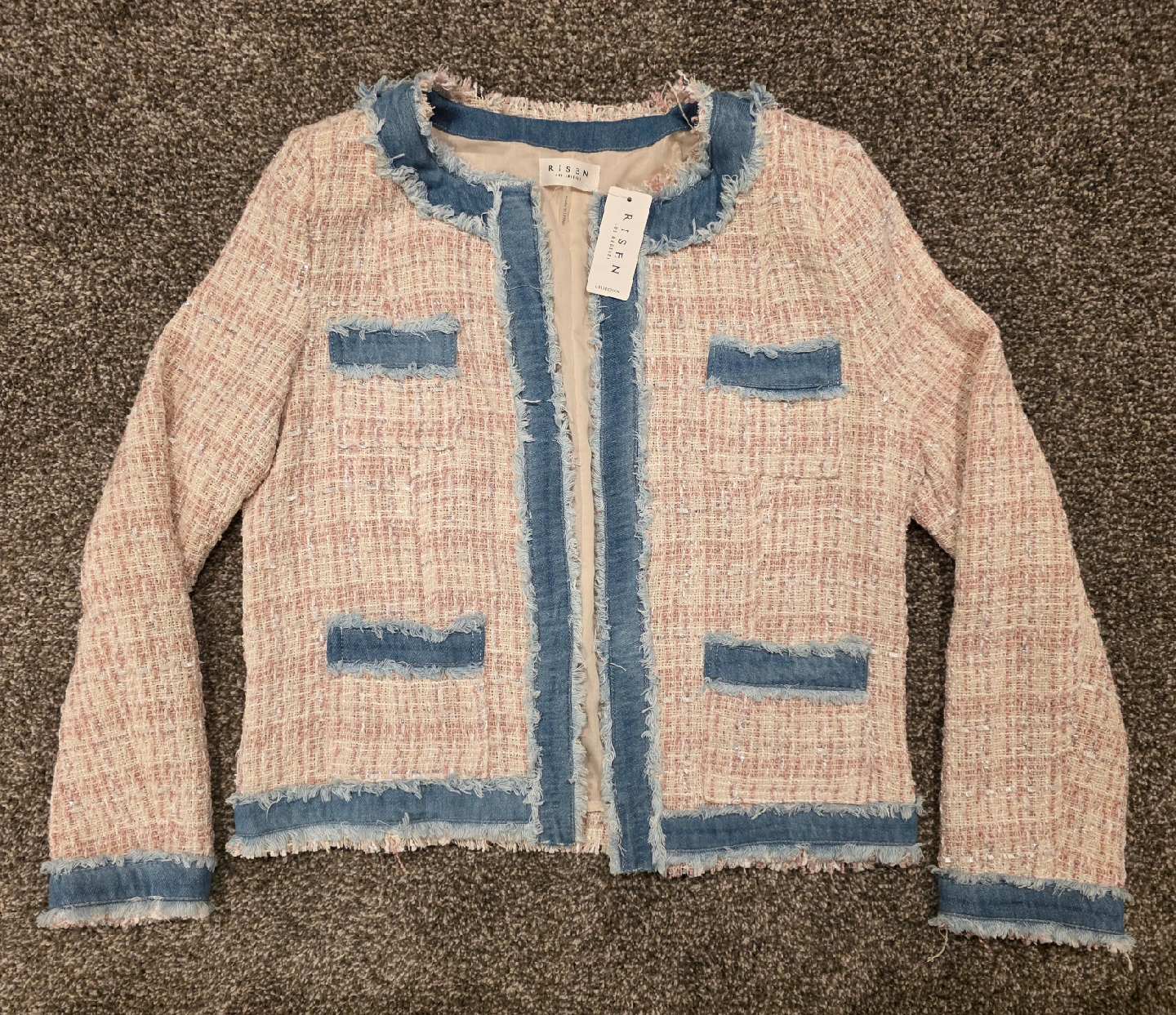 The Risen Soft Pink Tweed Blazer Jacket in size Large is a stylish and versatile outerwear piece perfect for casual occasions. Made from polyester with a tweed fabric type, this blazer features a button closure and comes in a flattering basic jacket style. The soft pink color adds a feminine touch, making it a great addition to women's summer, fall, and spring wardrobes. With a brand name of Risen, this jacket is a fashionable choice for those looking for a blend of comfort and style. Pick up in Naperville near naper blvd and 87th street or near downtown Naperville off of Chicago and Charles