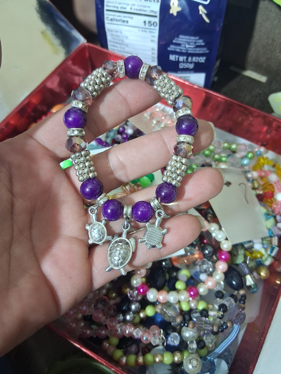 This is a cute purple beaded bracelet with little turtle charms! It's in great condition and would be a fun addition to any outfit