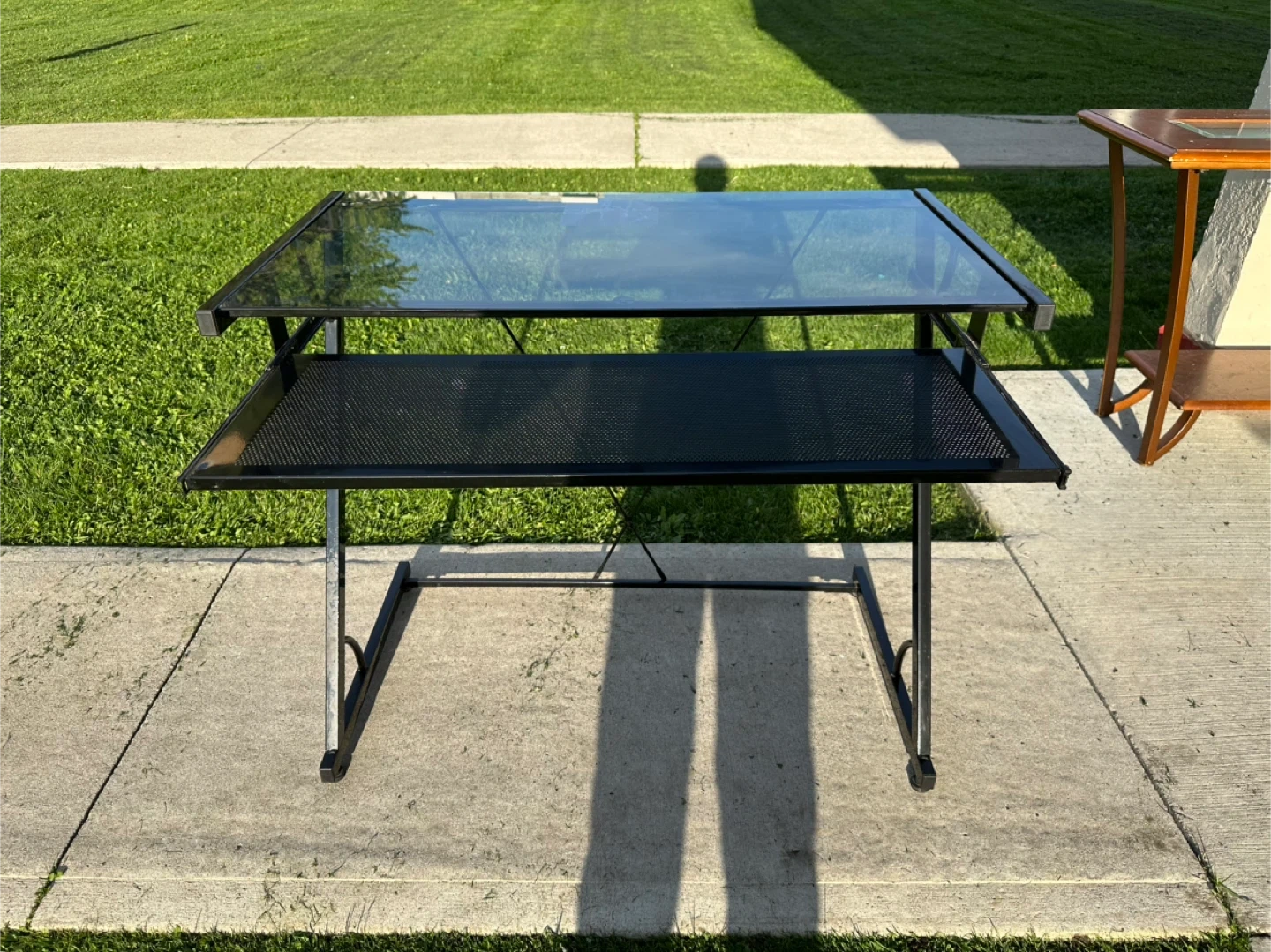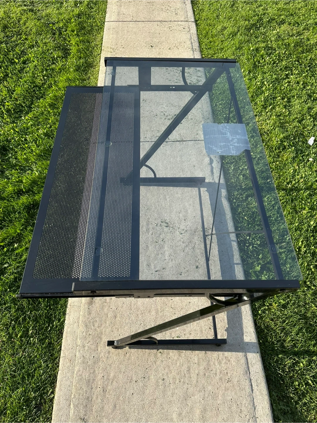 Here's a drafting table with a glass top and a black metal frame! It's in great shape and ready for your next project. Perfect for artists, architects, or anyone who needs a sturdy and adjustable workspace