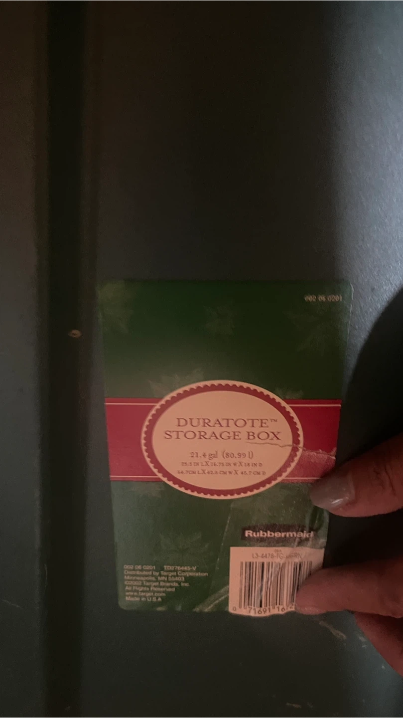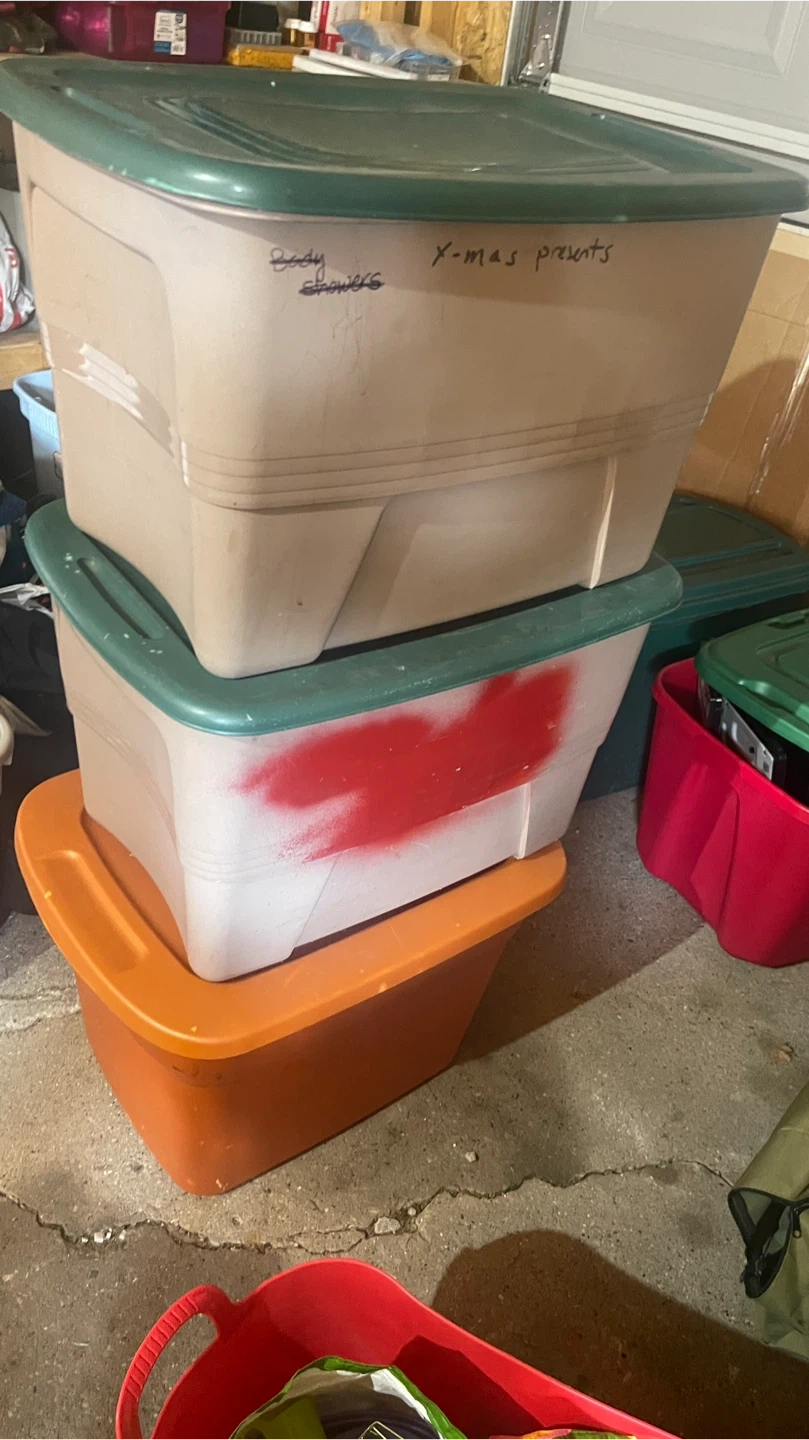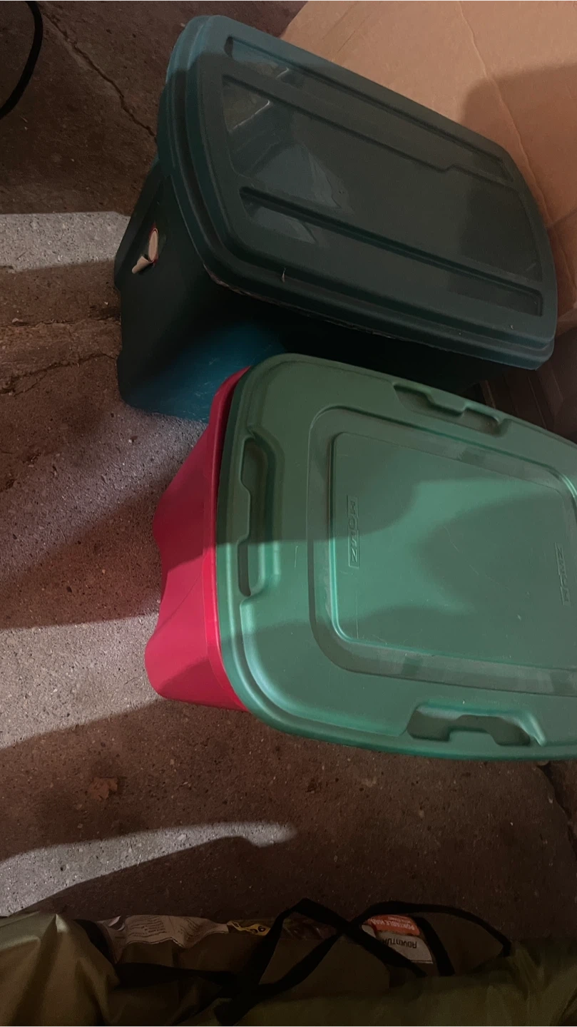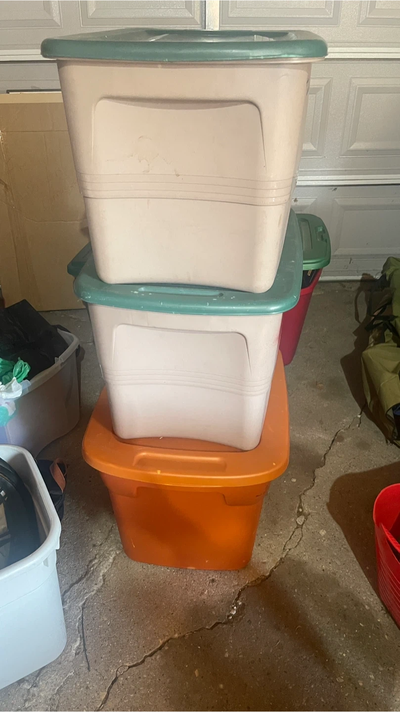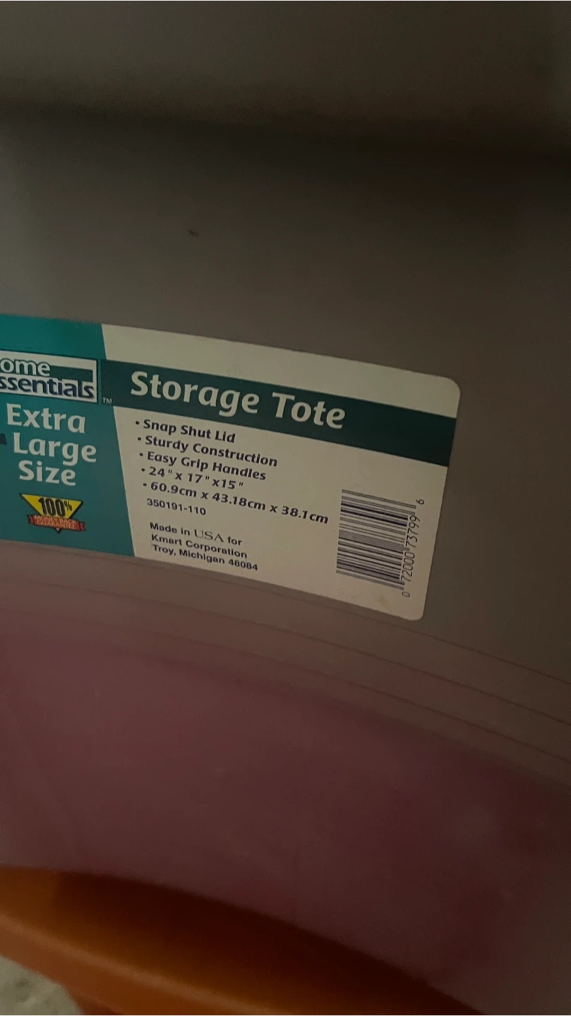 I have a few storage totes for sale. One is a Rubbermaid DuraTote 21.4 gal (80.99 l) storage box. Dimensions are 26.6" x 17.5" x 12.18" h or 66.7cm x 44.5cm x 31 cm h. Another is a Home Essentials Extra Large Size Storage Tote with a Snap Shut Lid and easy grip handles. Dimensions are 24" x 17" x 15" or 60.9cm x 43.18cm x 38.1cm look at pics closely there is some writing outside the boxes