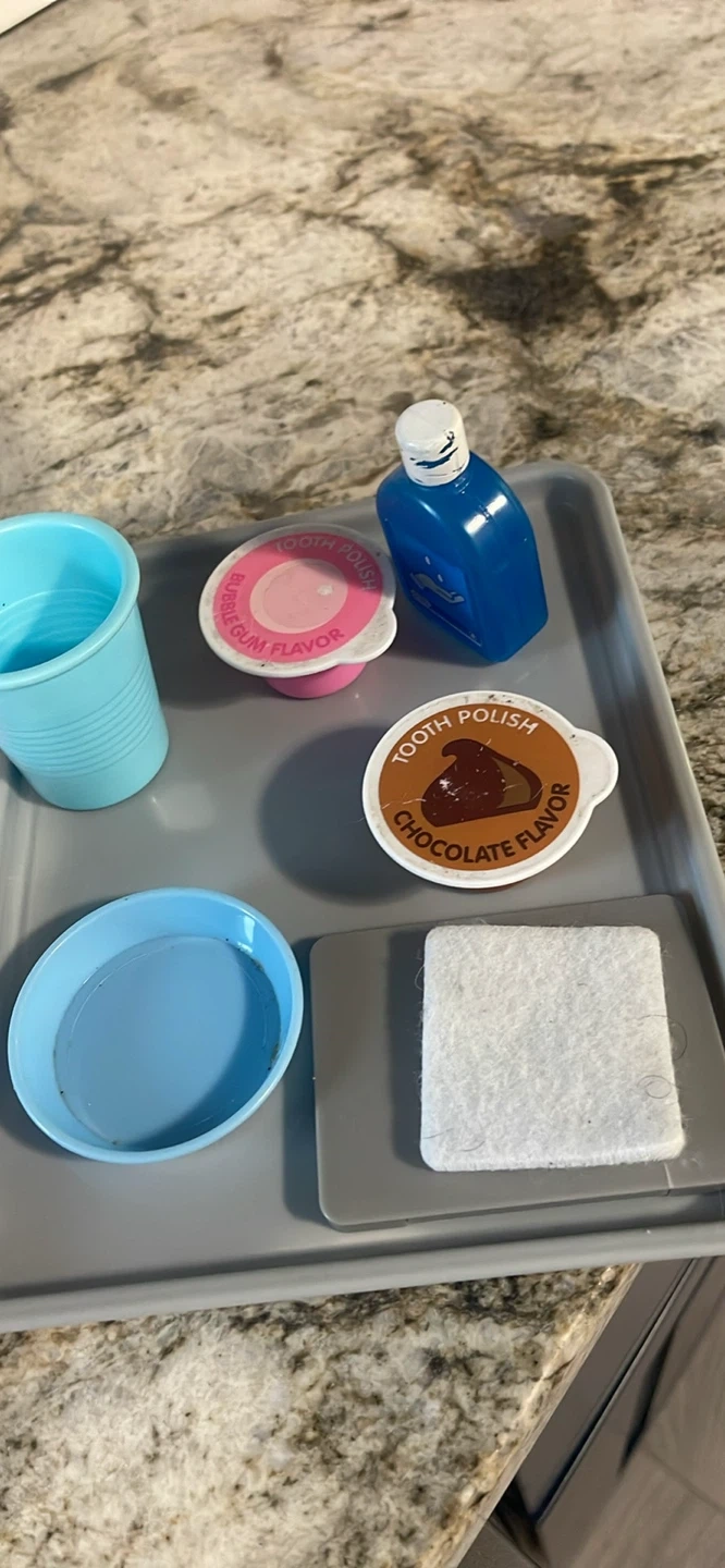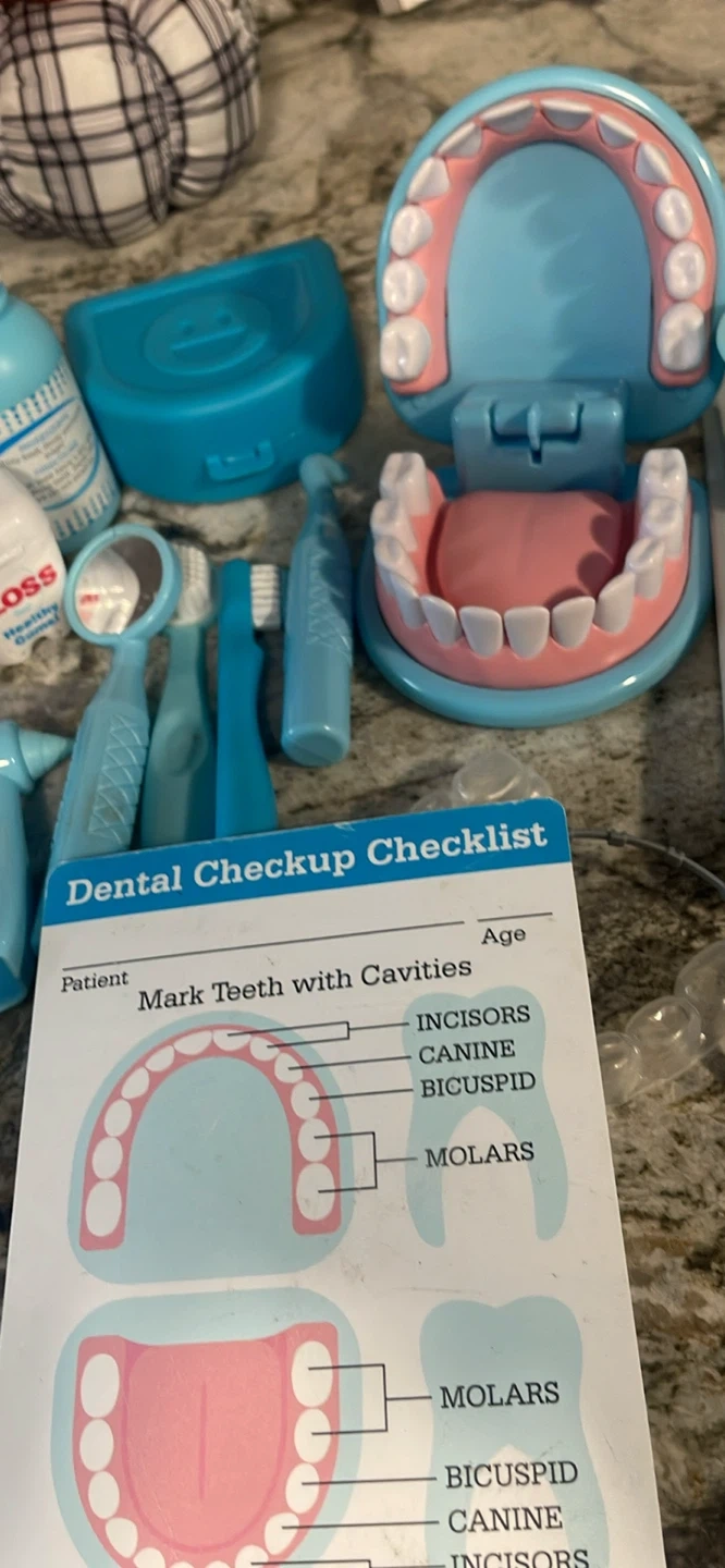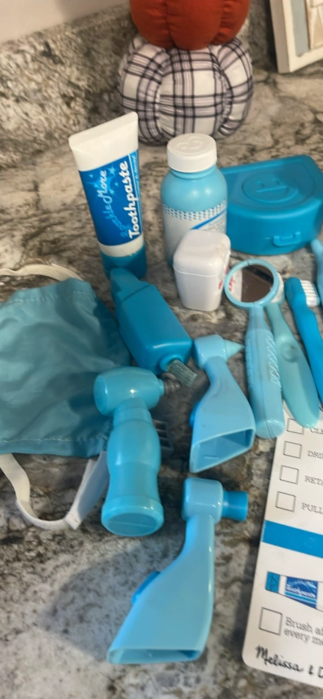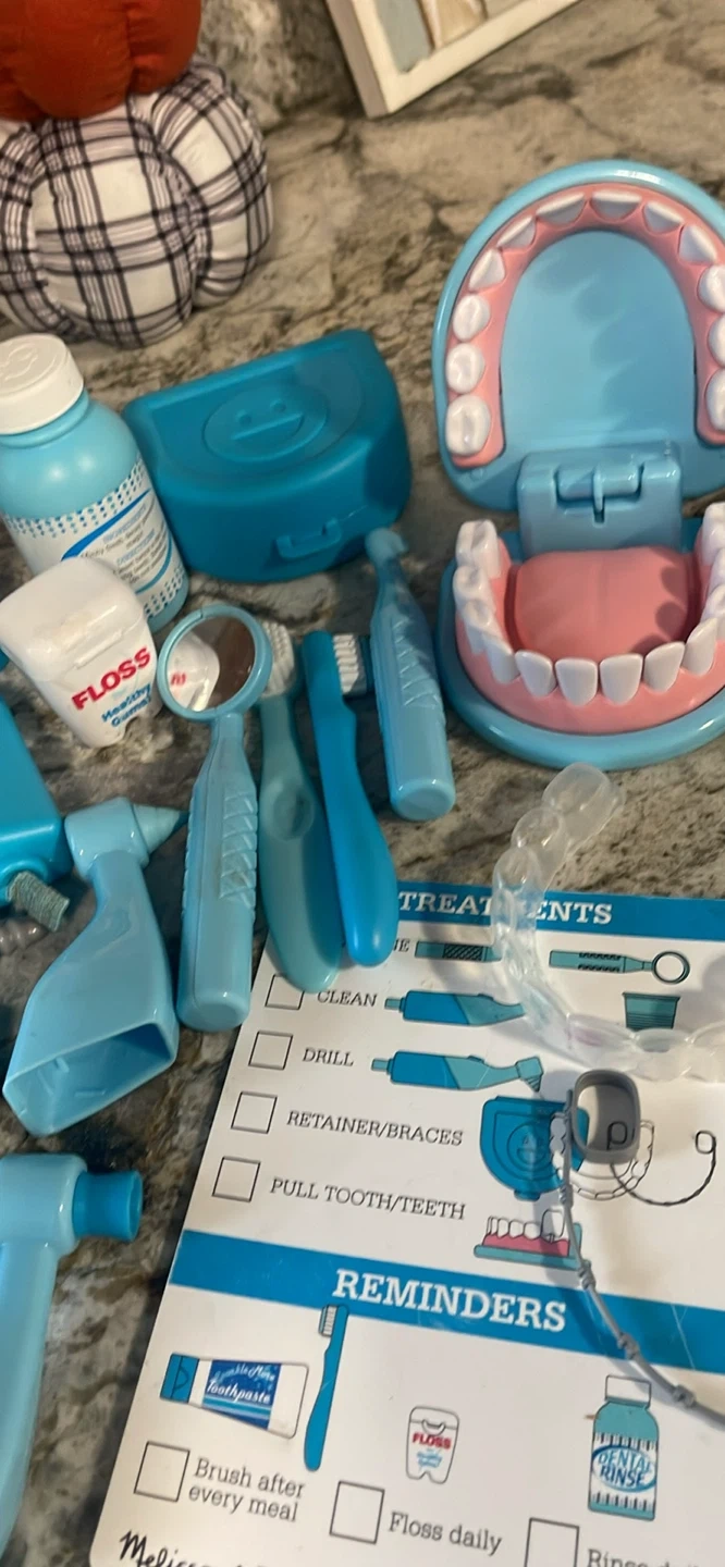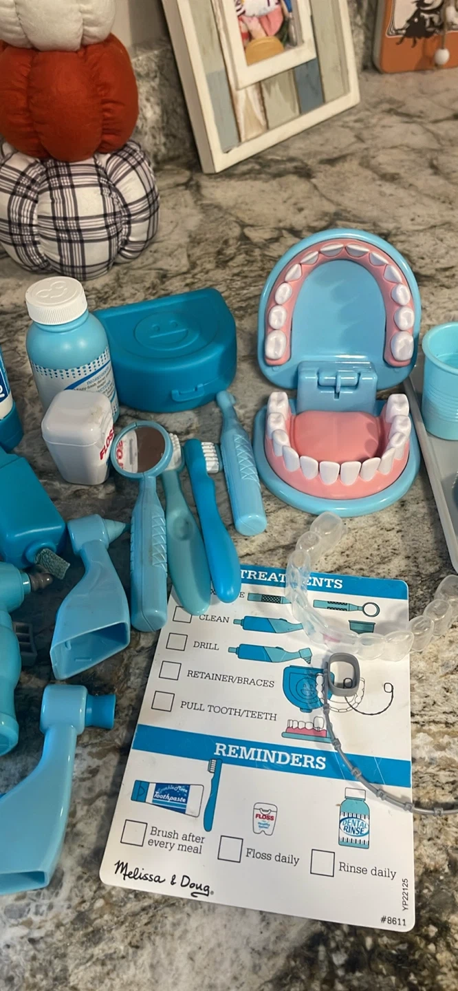 This Melissa & Doug dentist kit is perfect for your little one! It comes with everything pictured, including a dental checkup checklist, toothbrush, toothpaste, and more. It's a great way to encourage imaginative play and teach good dental hygiene habits