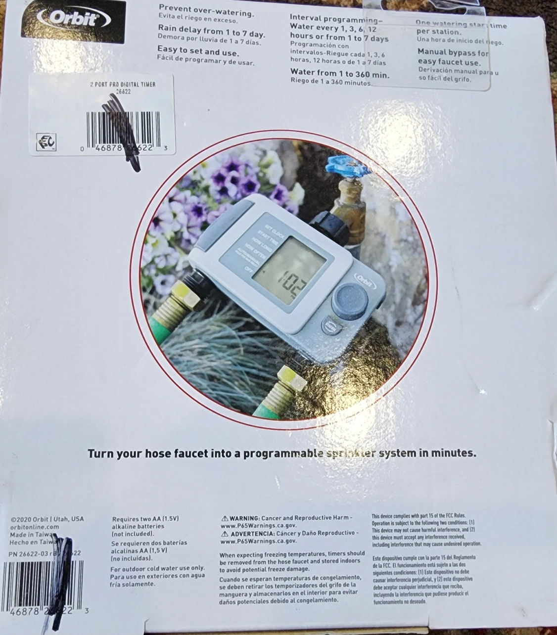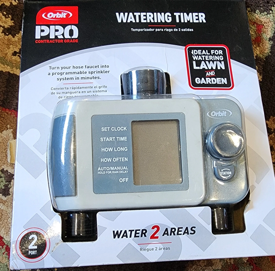 I'm selling an Orbit Pro Contractor Grade 2-Port Digital Watering Timer. It's ideal for watering lawn and garden areas. This timer makes it easy to set up a programmable sprinkler system in minutes. It features interval programming, allowing you to water every 1, 3, 6, or 12 hours, or from 1 to 7 days. You can also set a one-watering start time per station. It's easy to set up and use