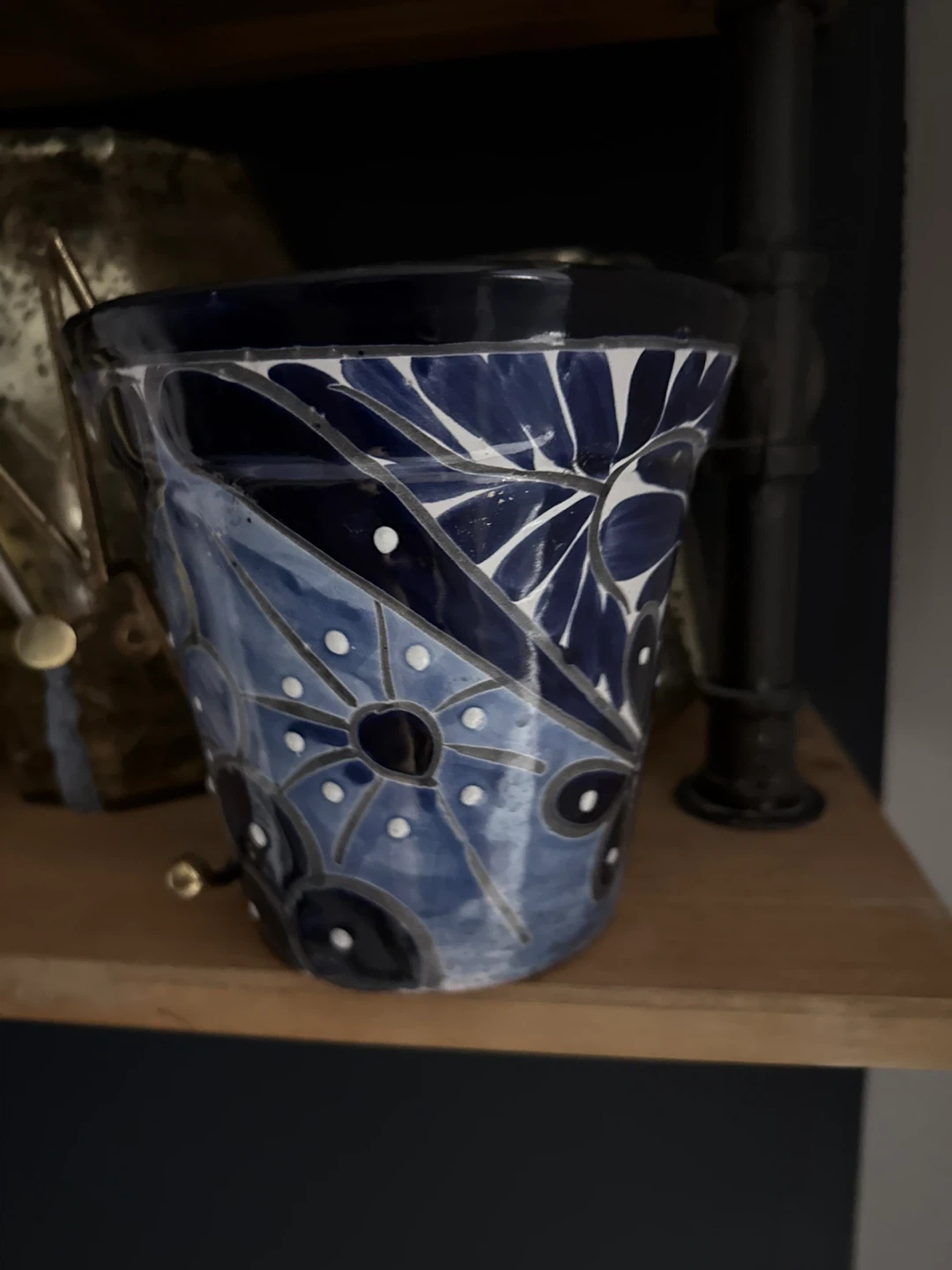Selling a blue decorative flower pot. It has a unique design with white accents. Perfect for adding a touch of style to your home or garden
