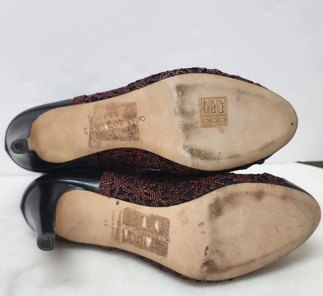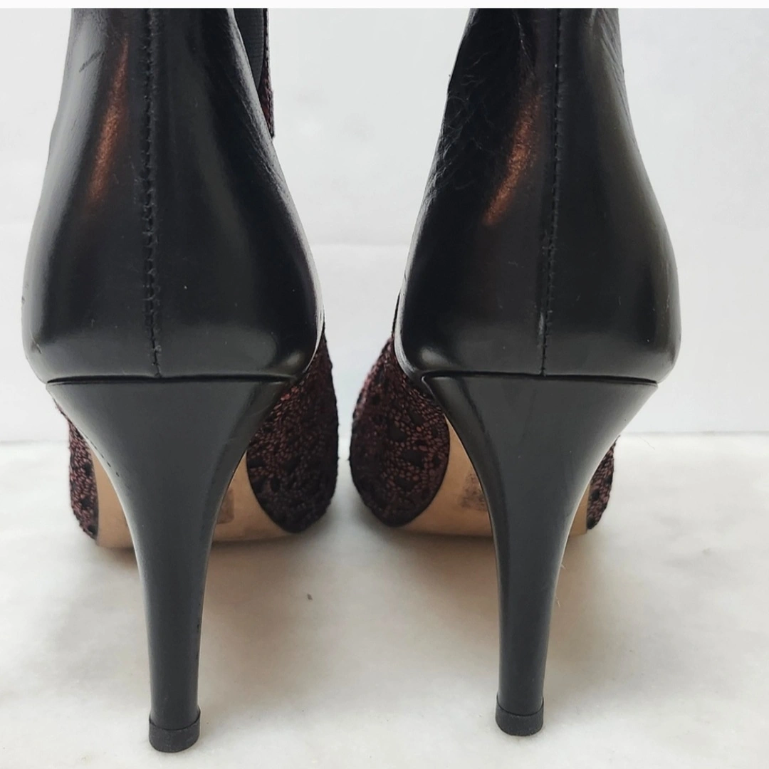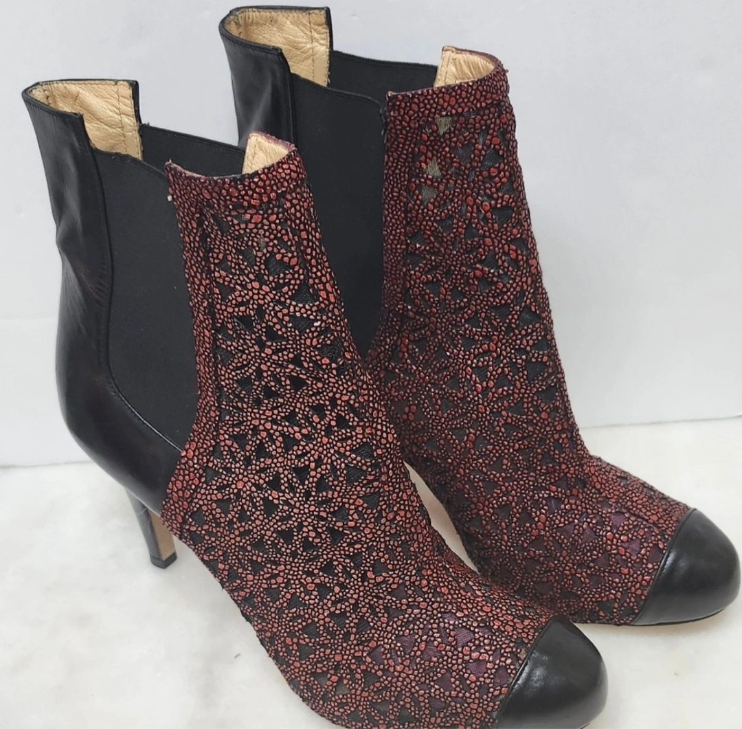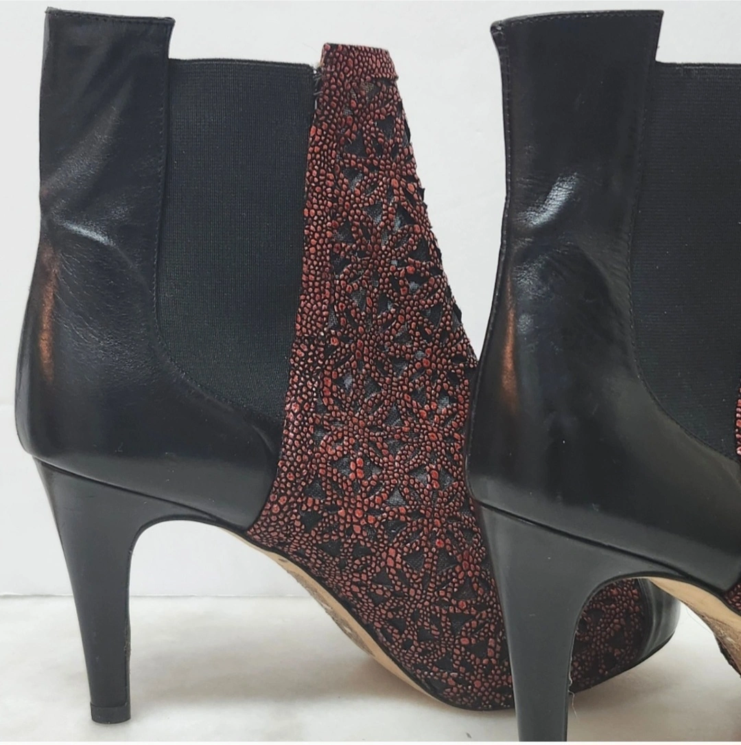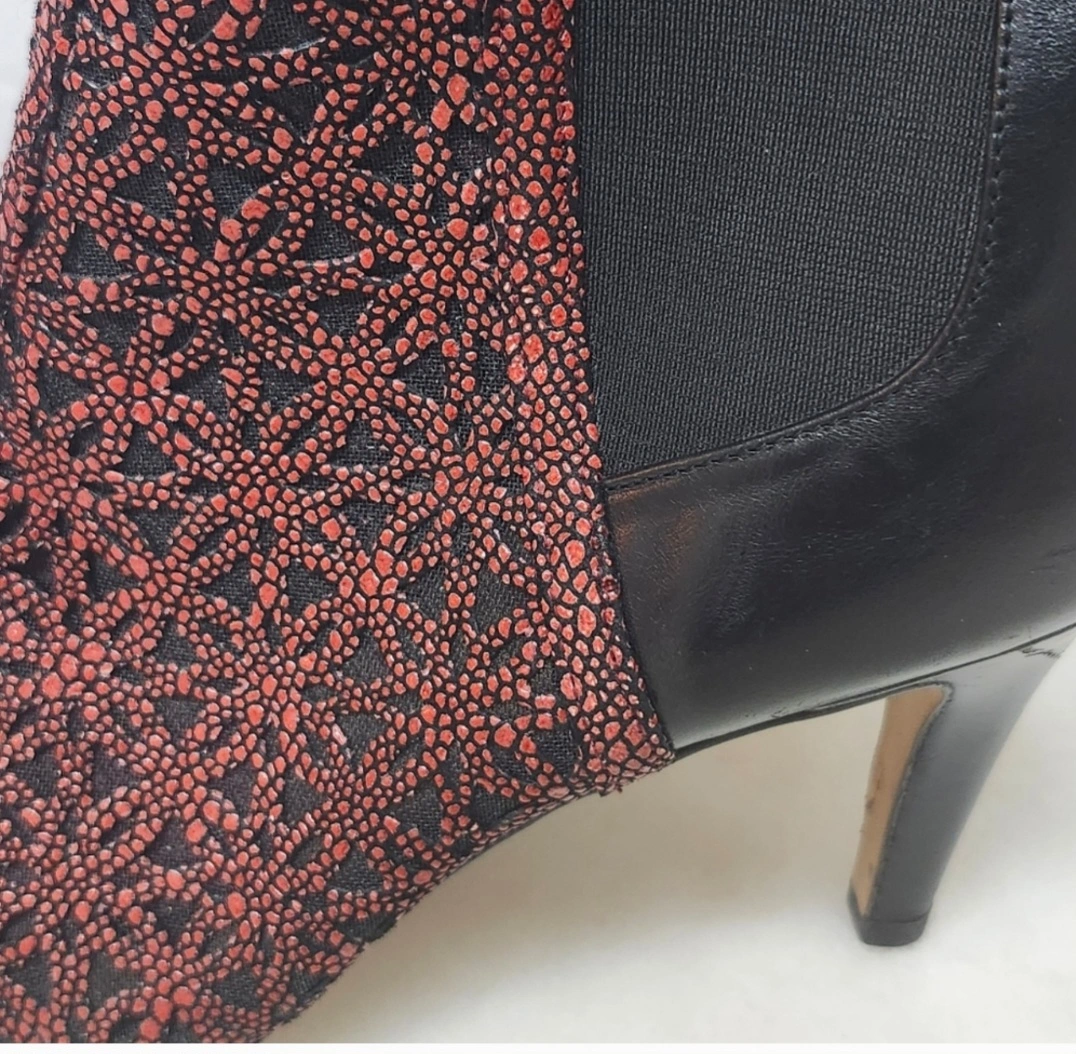 These Carmen Marc Valvo booties are a unique addition to any wardrobe! They feature a black leather upper with a deep red and black patterned fabric on the vamp and sides. The heel adds a touch of elegance, making them perfect for dressing up or down. Size 9 ...Worn one time.