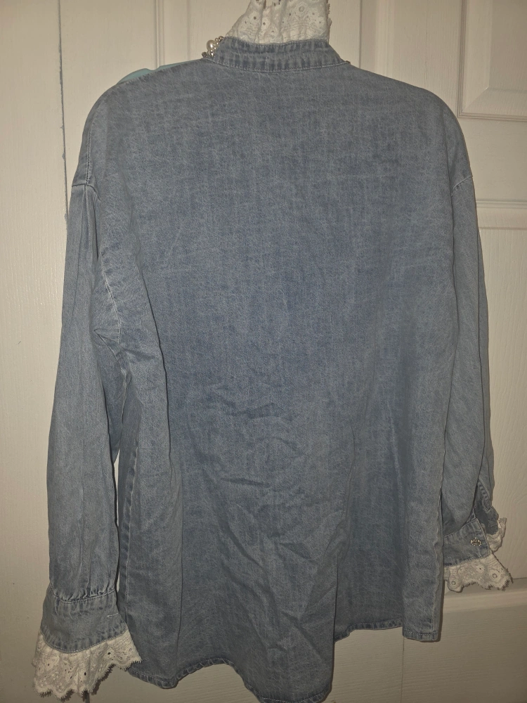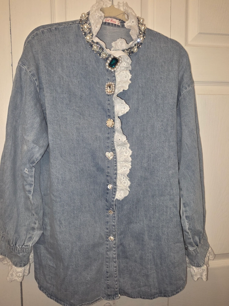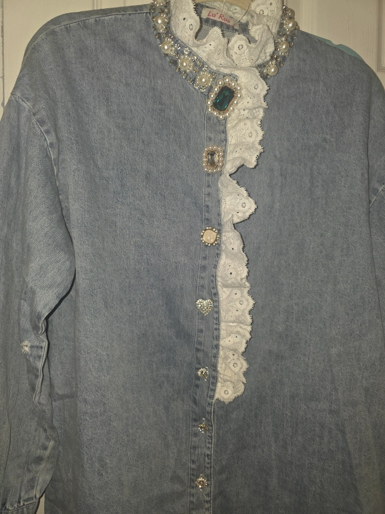 Selling a La'Ros denim shirt with unique embellishments! It features lace details and decorative buttons. Perfect for adding a vintage touch to your wardrobe. oversized can fit up to a large.