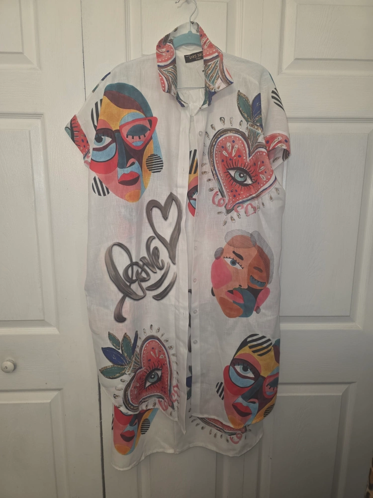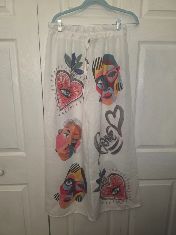 This is a 2piece suit can be worm separate white linen from the Italian designer Dis Moi.They feature a unique design with colorful faces and hearts. Perfect for a casual, stylish look!