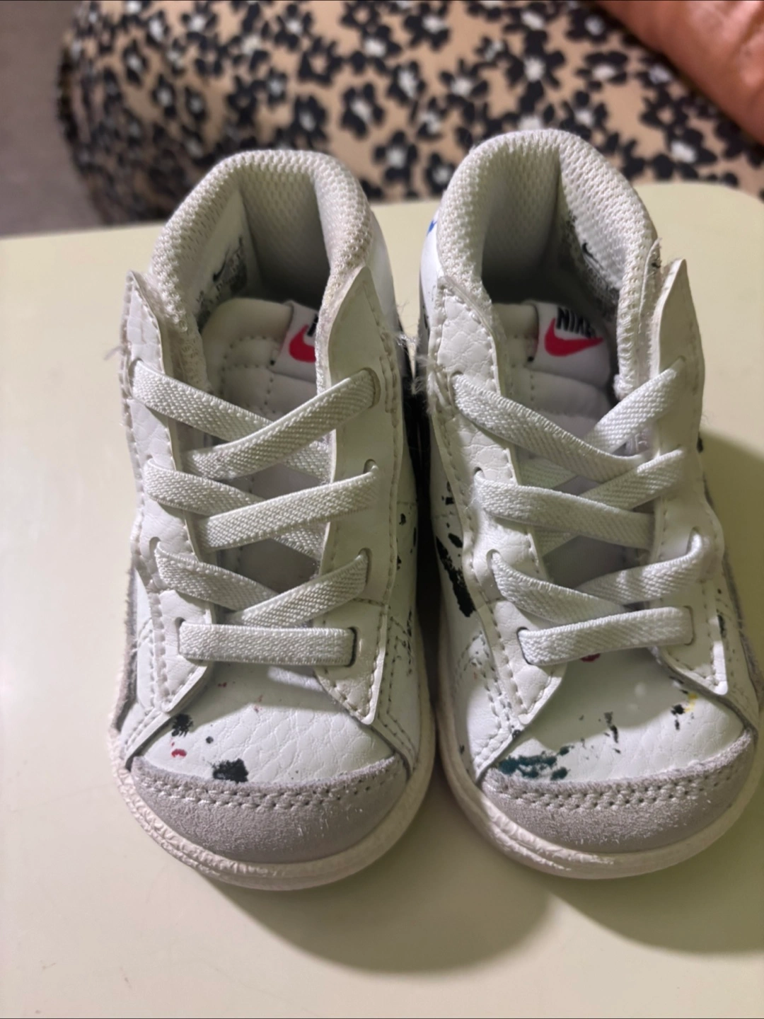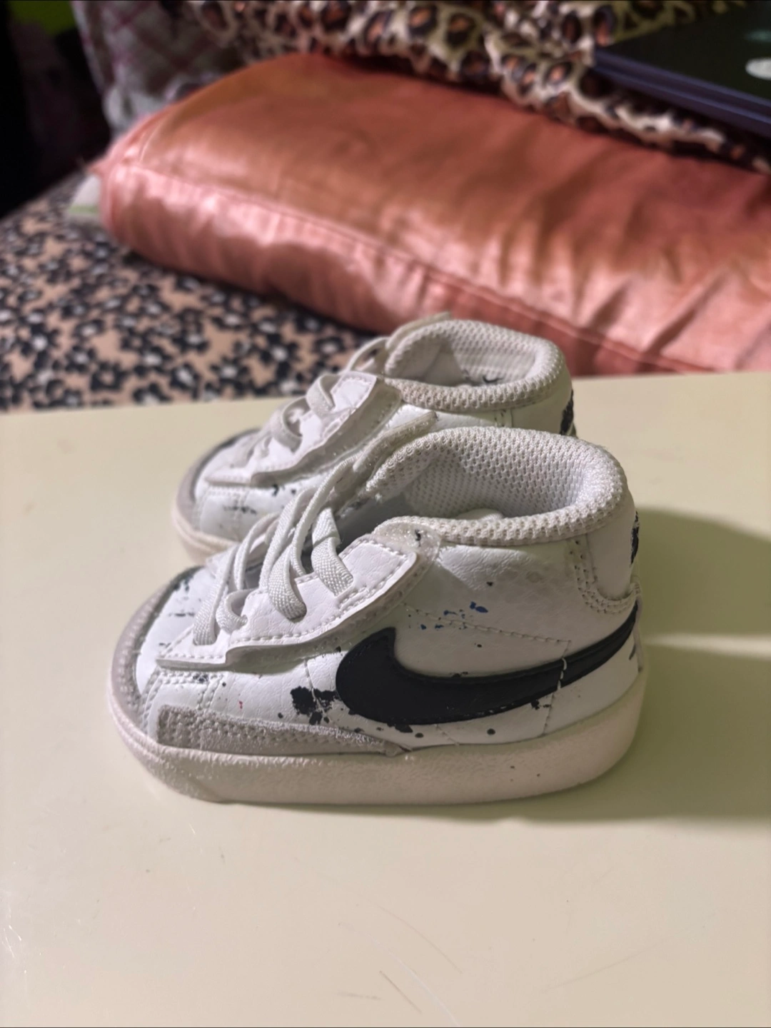 These are a pair of Nike Blazer Low baby shoes. They have a white base with black accents and a black Nike swoosh. They are in used condition with some marks and scuffs. The paint splats is the style of the sneakers , it was bought like that. Size 4C
