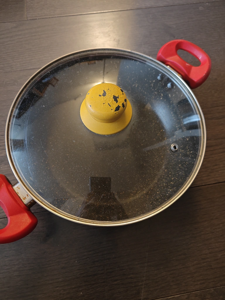 Round frying pan with a dark speckled interior. Features red handles. Could be a great addition to any kitchen, for a calm and relaxing cooking experience. used.