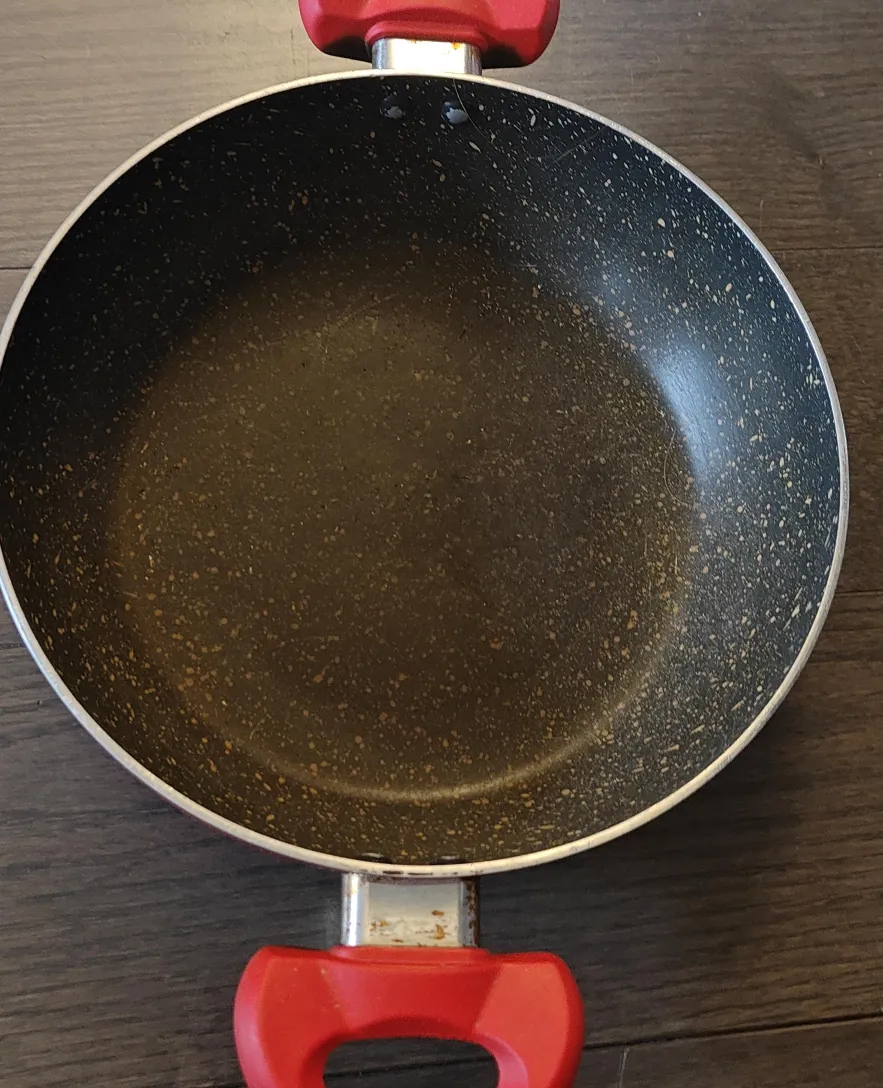 Round frying pan with a dark speckled interior. Features red handles. Could be a great addition to any kitchen, for a calm and relaxing cooking experience. used.