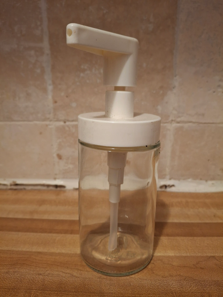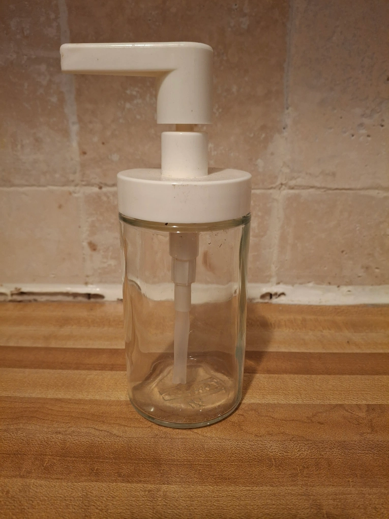 Selling a clear glass syrupluquid soap dispenser with a white pump. It's in good condition and ready to use! Perfect for adding a touch of retro style to your breakfast table, fir your kitchen or bathroom.