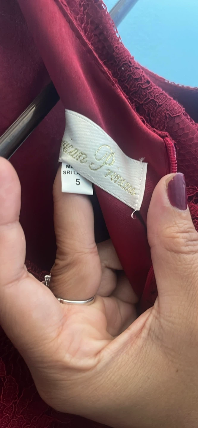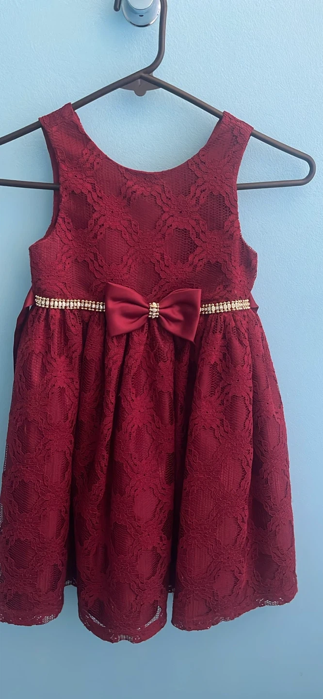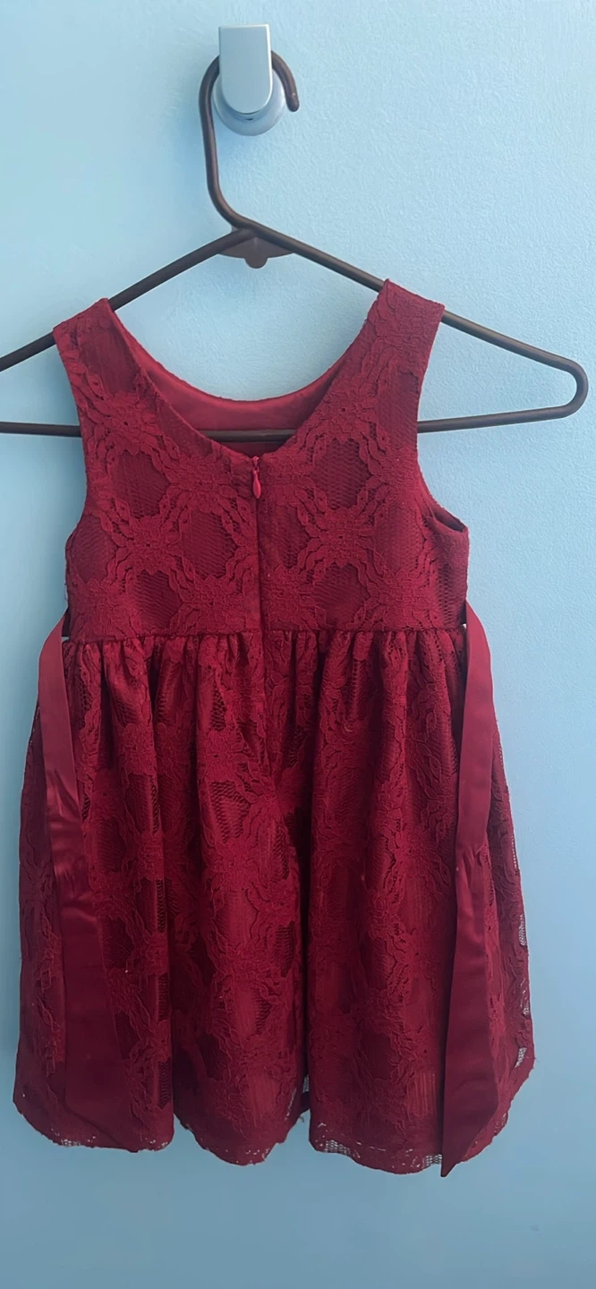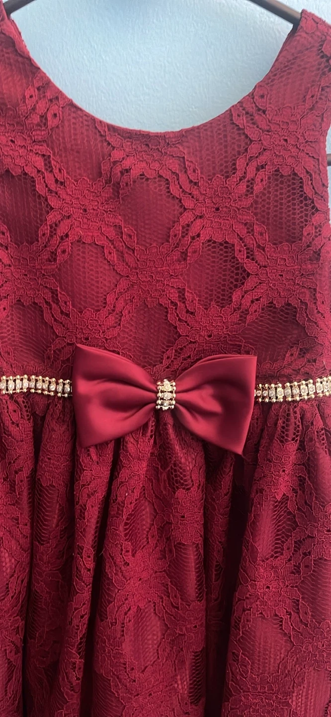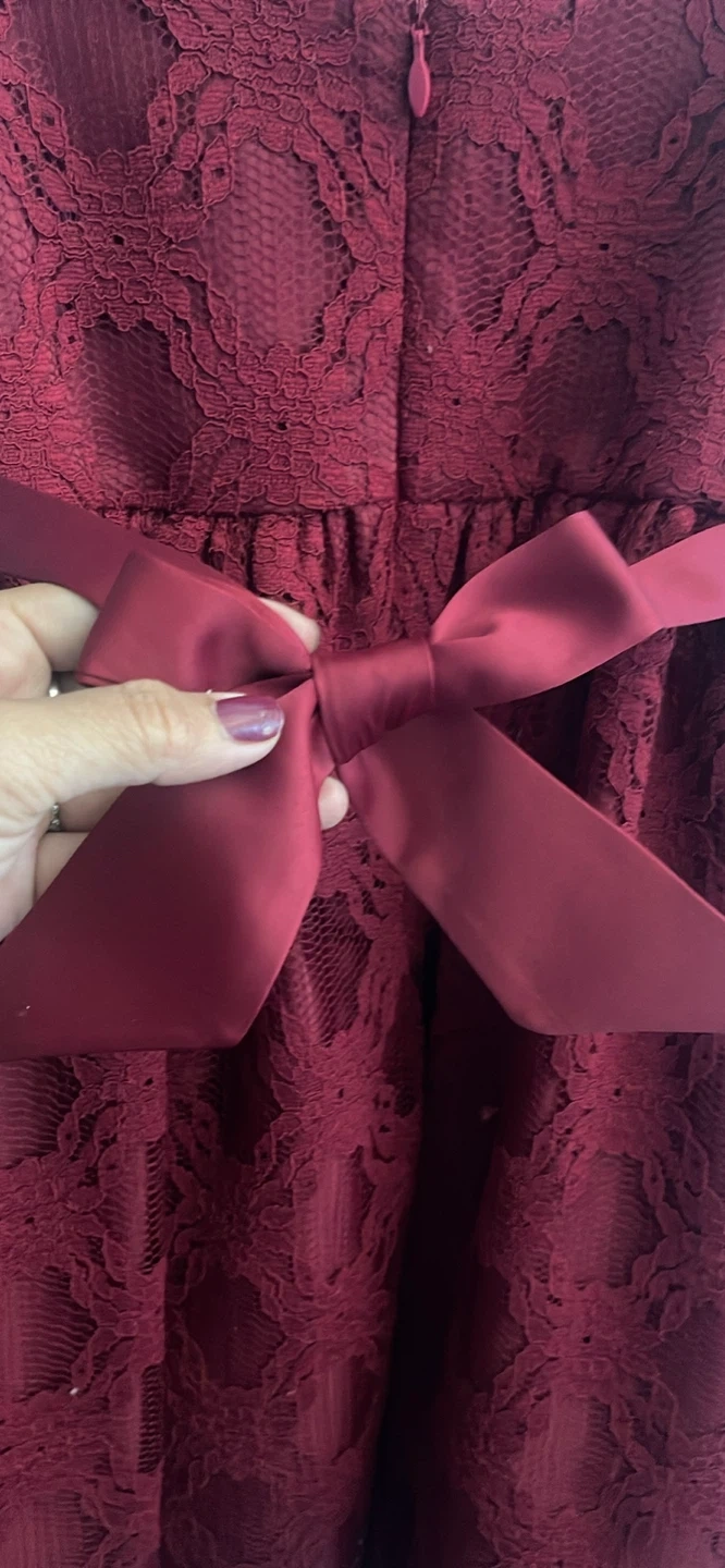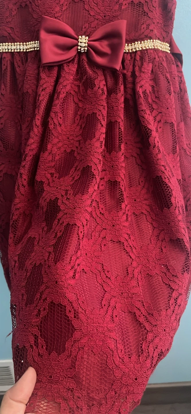 This is a beautiful burgundy lace dress with a bow. It's in great condition and perfect for a special occasion!