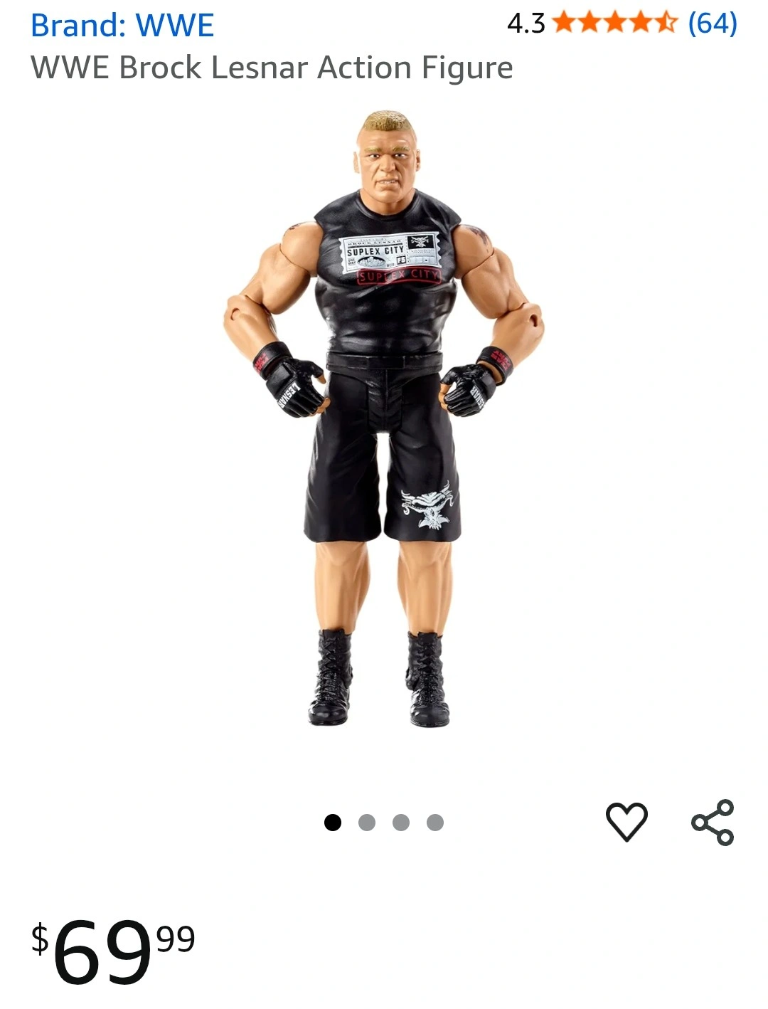Selling a WWE Brock Lesnar action figure. It's in used good condition and ready for a new home! Originally priced at $69.99.