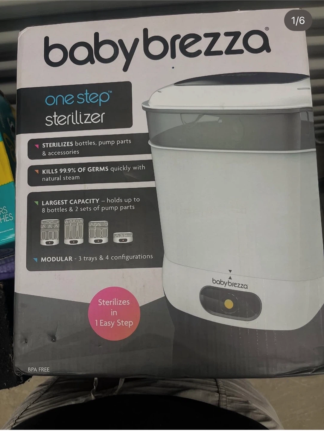 Selling a Baby Brezza One Step Sterilizer! It sterilizes bottles, pump parts, and accessories with natural steam, killing 99.9% of germs quickly. It has a large capacity, holding up to 8 bottles and 2 sets of pump parts. The sterilizer is modular with 3 trays and 4 configurations, making it easy to sterilize in one step