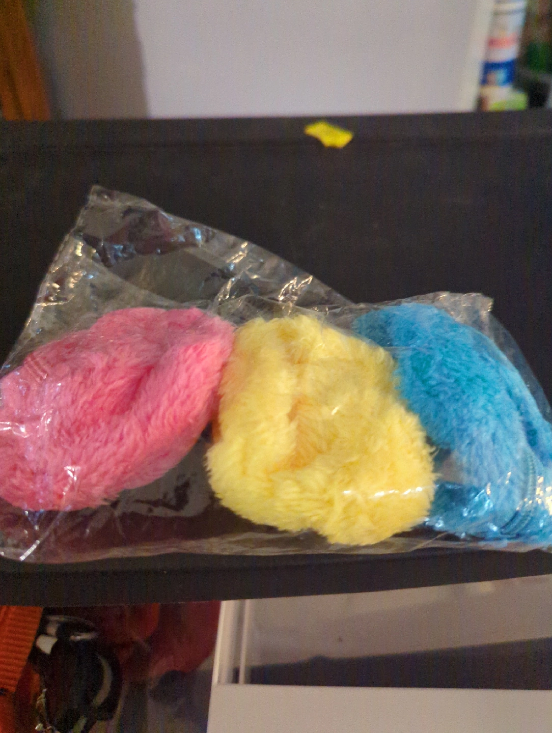 I have a set of fluffy pouches in pink, yellow, and blue. They are still in their original packaging. can be used for variety of things.