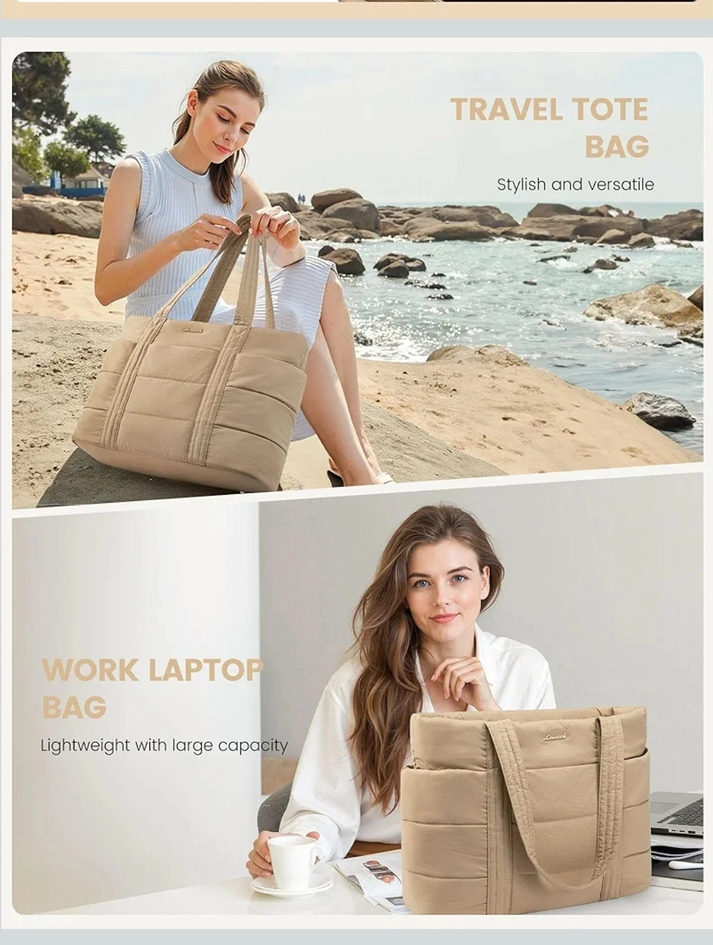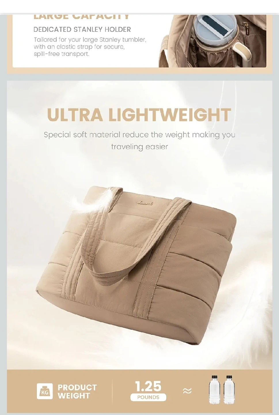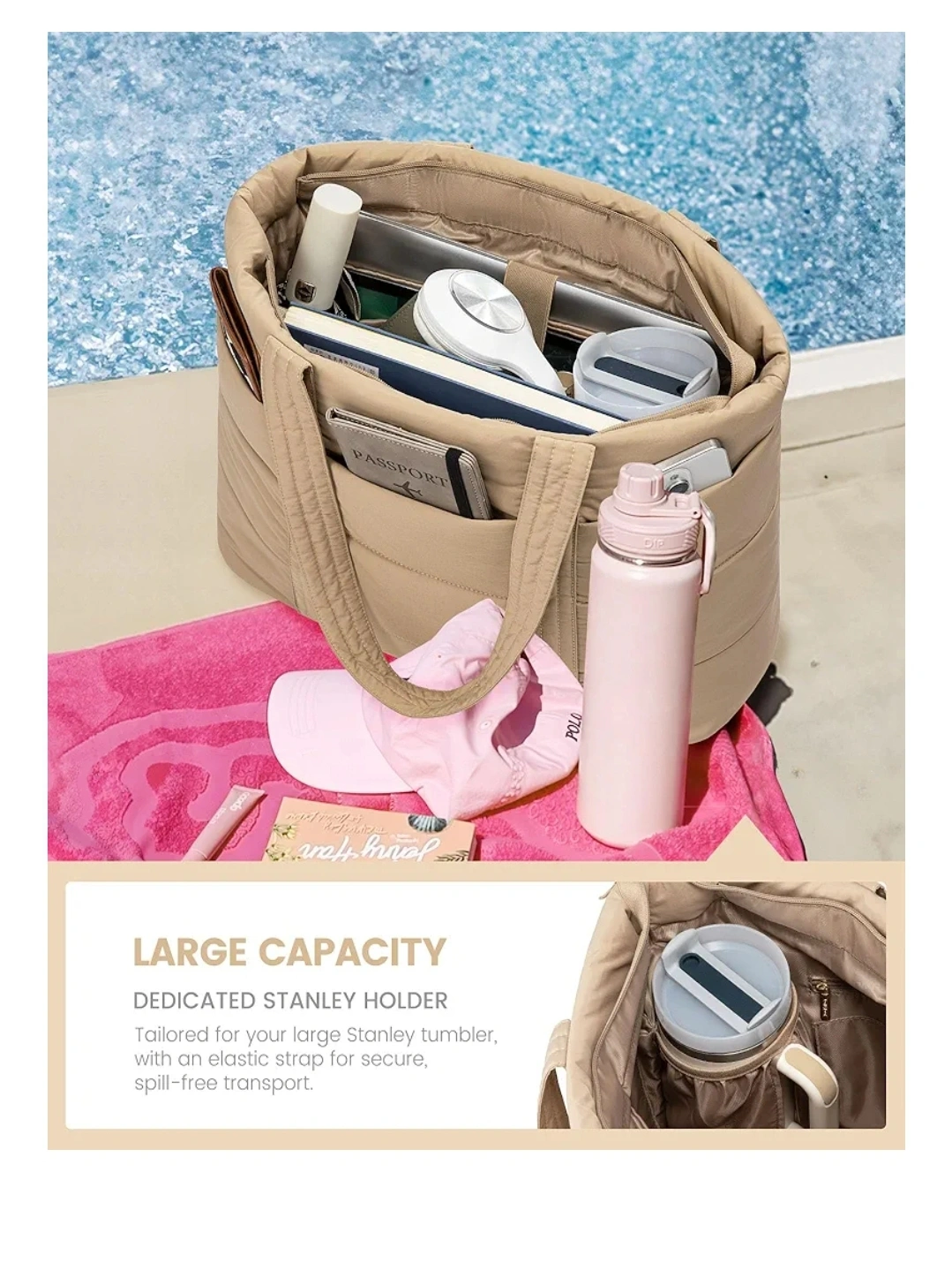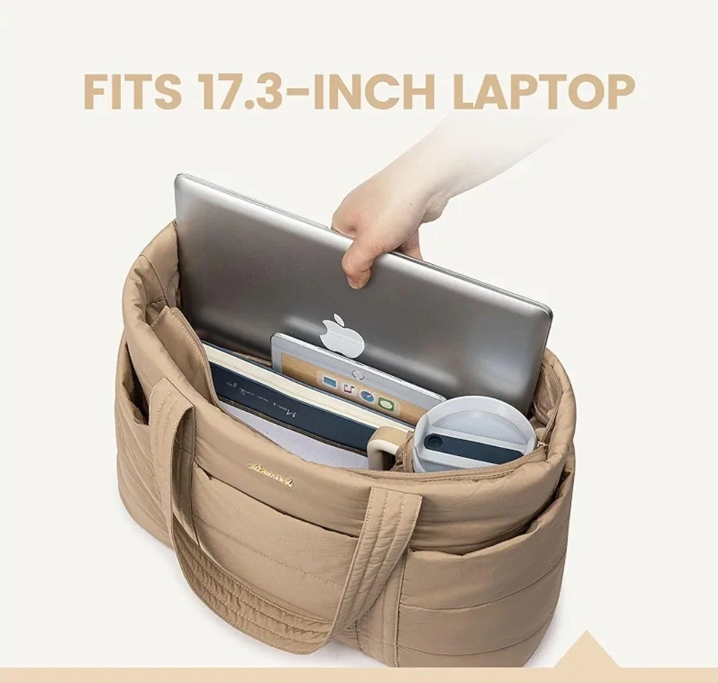 This stylish and versatile travel tote bag is perfect for work or travel! It's lightweight and has a large capacity, fitting up to a 17.3-inch laptop. It also features a dedicated Stanley holder with an elastic strap for secure, spill-free transport.