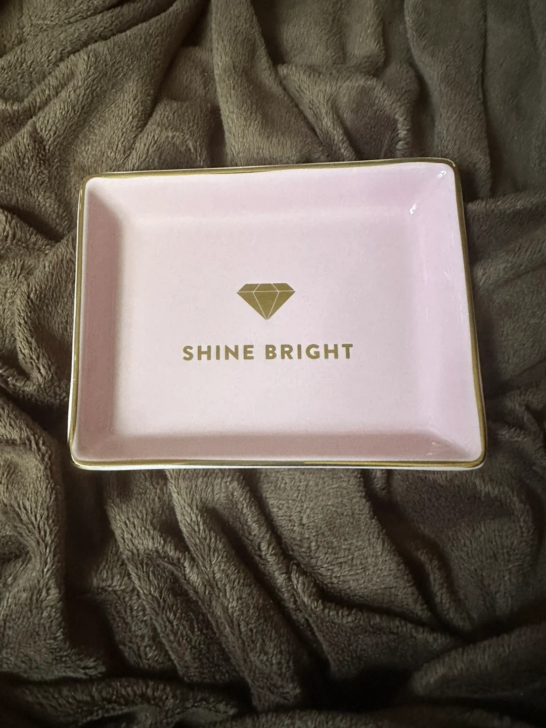 Selling a cute trinket dish from Indigo! It's a light pink colour with gold trim and says 'Shine Bright' in gold lettering. Perfect for storing jewellery or other small items.