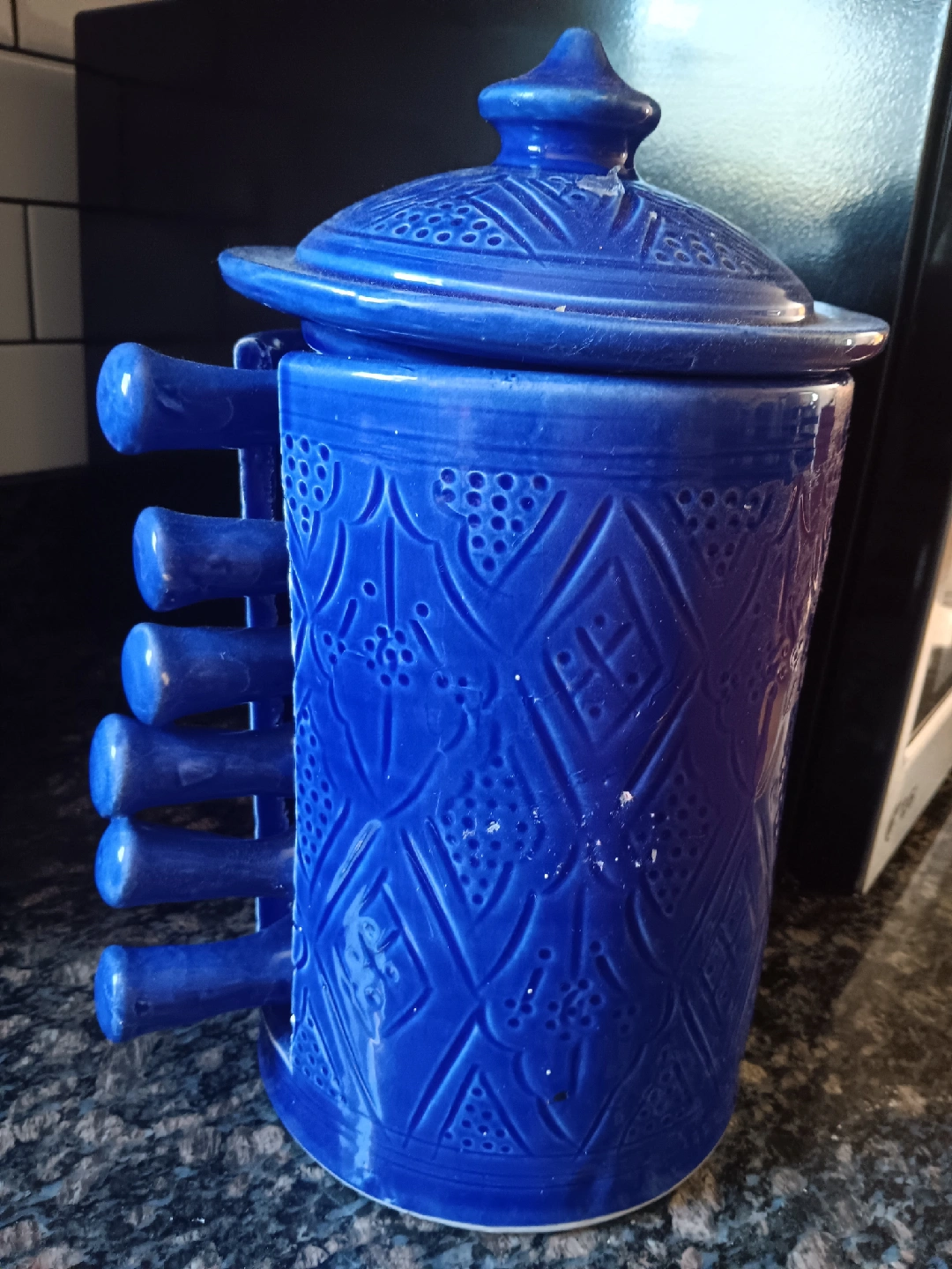 Selling a unique blue ceramic jar with a lid and built-in spoon holders. It features a beautiful embossed design. There is a minor chip on the lid. It's perfect for adding a touch of charm to your kitchen or dining area