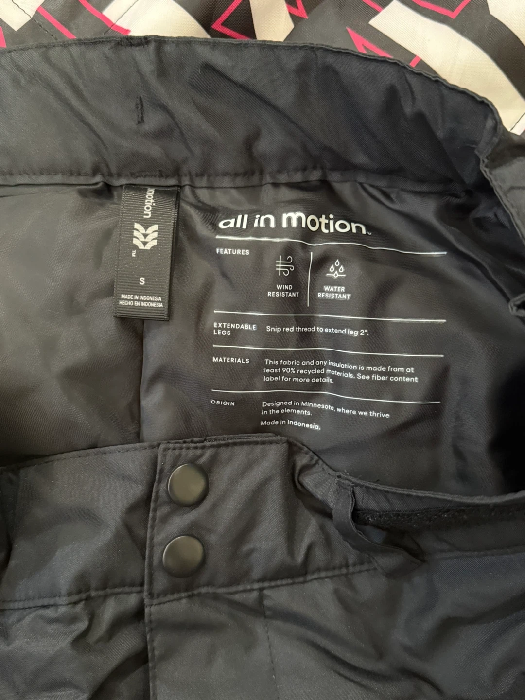 Selling a pair of All in Motion snow pants in size small! They are wind and water resistant. You can even snip the red thread to extend the leg by 2". Made from at least 90% recycled materials!