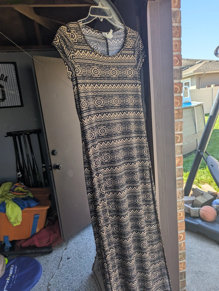 Selling a patterned maxi dress. It features a unique design and a comfortable fit. Perfect for casual outings or dressing up for a special occasion! It's in great condition and ready for a new home