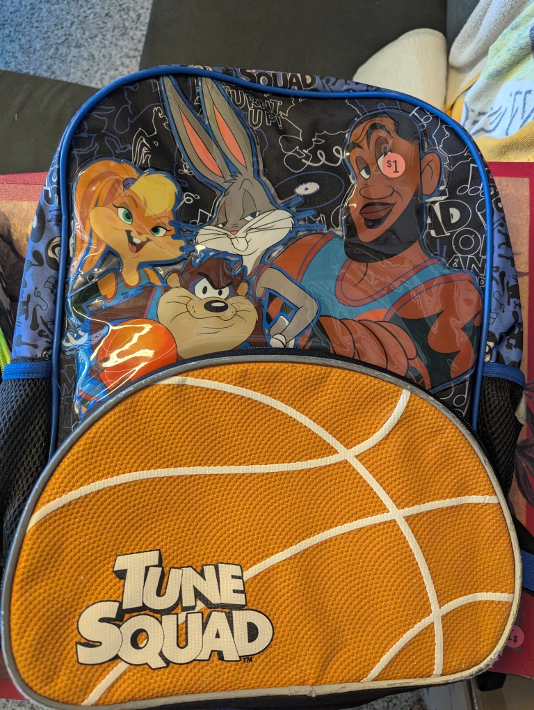 Here's a fun backpack featuring the Tune Squad from Space Jam! It has a cool design with Bugs Bunny, Lola Bunny, and LeBron James. Perfect for any Space Jam fan!