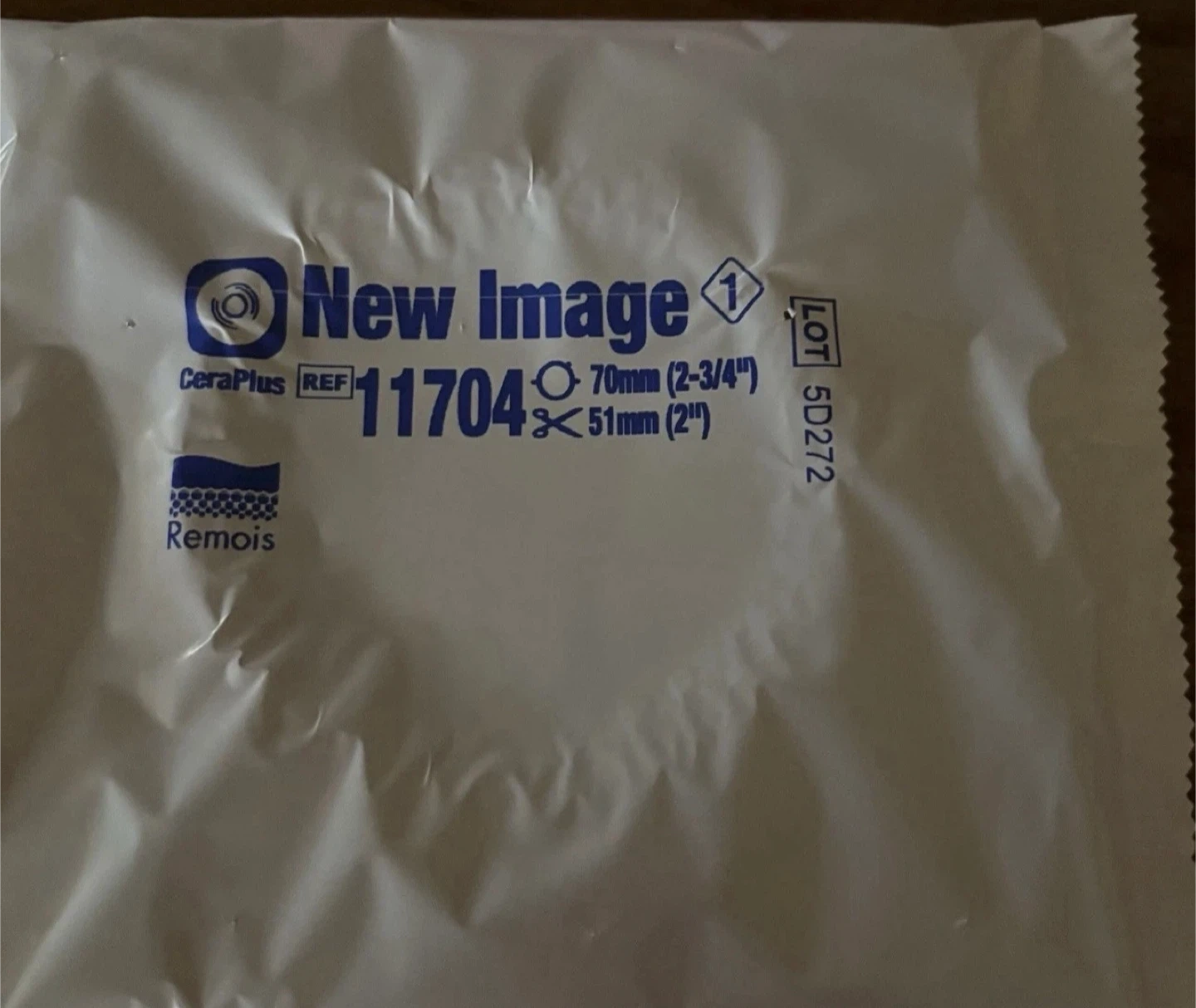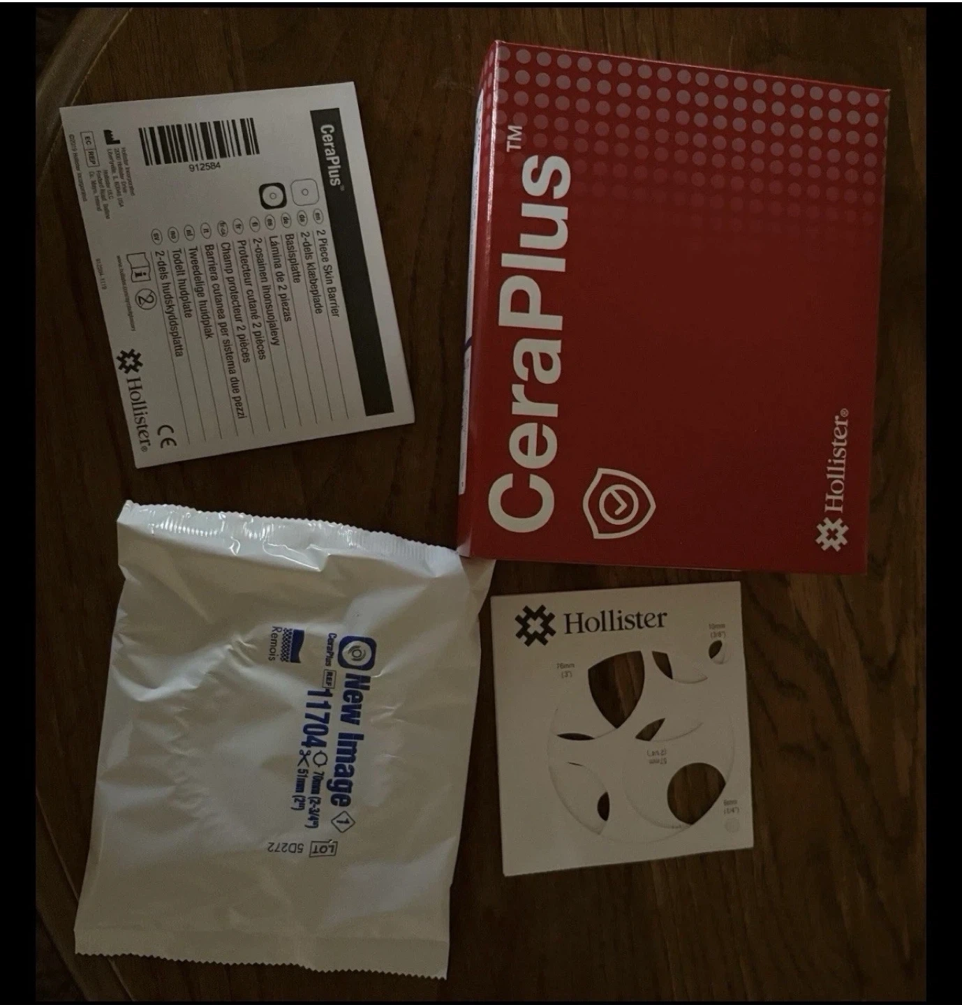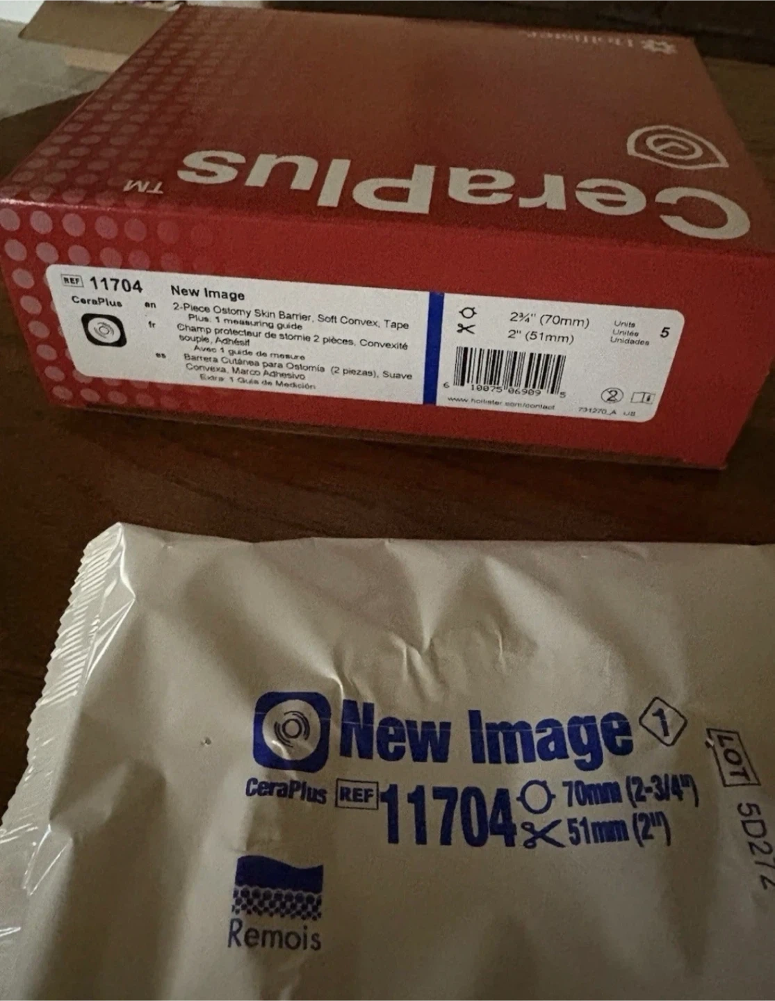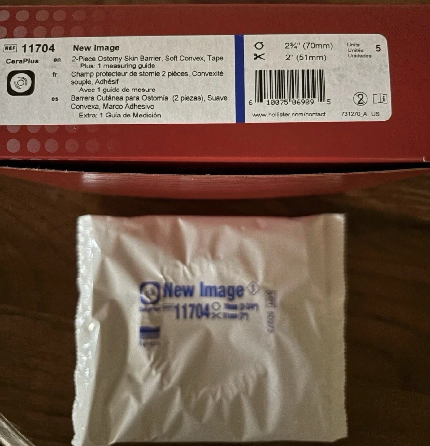 Selling a new 11704 Hollister New Image CeraPlus ostomy/Ileostomy skin barrier. It's a 2-piece system, soft convex with tape. The size is 70mm (2-3/4") and 51mm (2"). 11704 , Hollister New Image Skin Barrier. Cut to Fit. There are 5 units included