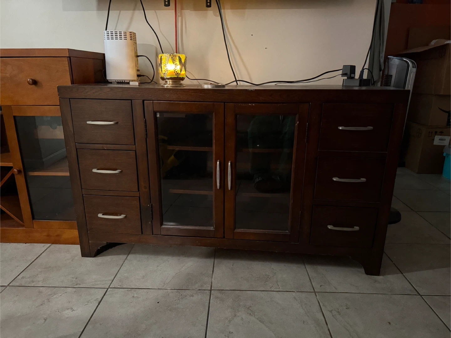Selling a dark wood media console. It has both drawers and glass-fronted doors for storage. There are some signs of use on the top surface.