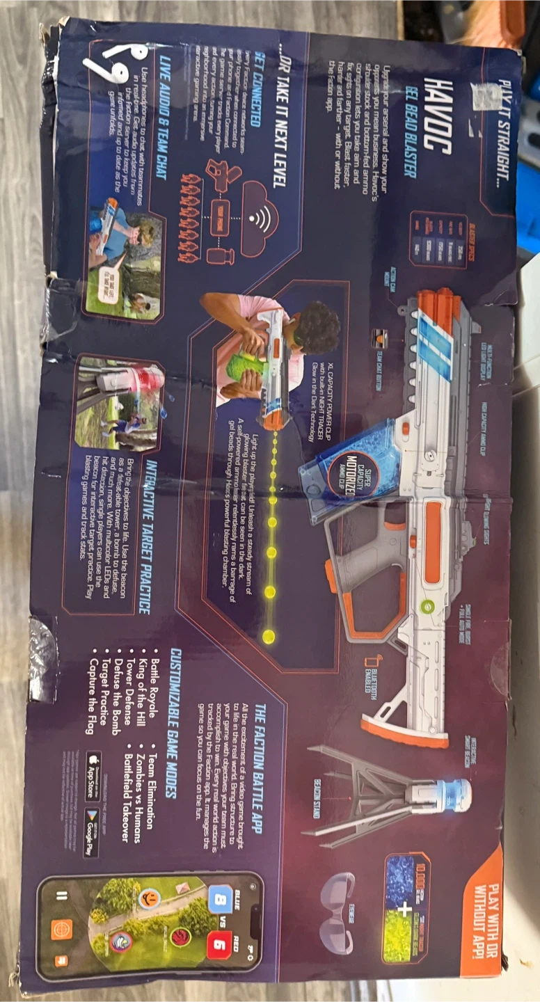Selling a brand new Faction Battle System Havoc Gel Bead Blaster! It's never been used and comes in its original box with all components included. This blaster is designed for both play with or without the app, offering interactive target practice and customizable game modes. Get ready for some action!