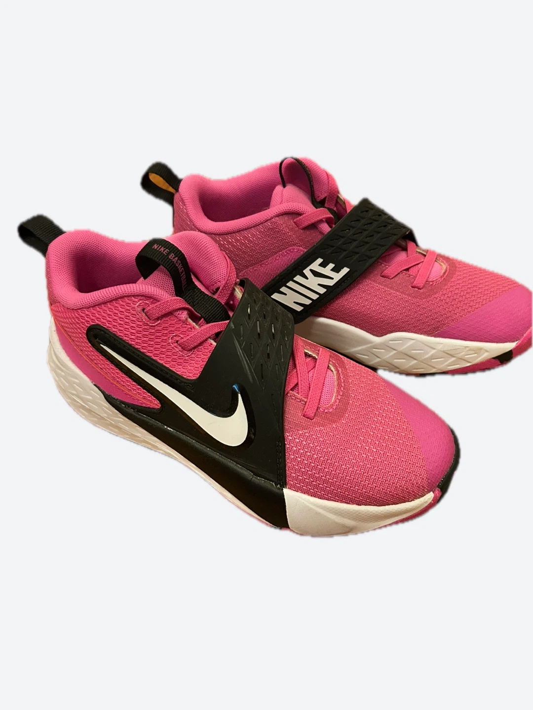 These are pink Nike basketball shoes. They feature a velcro strap for a secure fit. Designed for performance on the court! Size 3Y.
