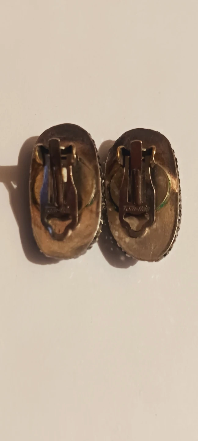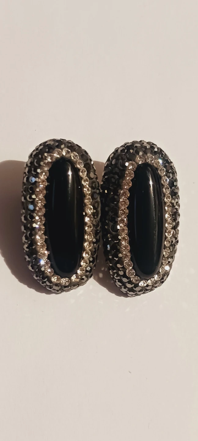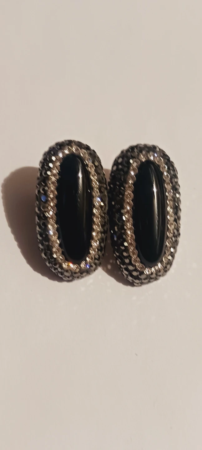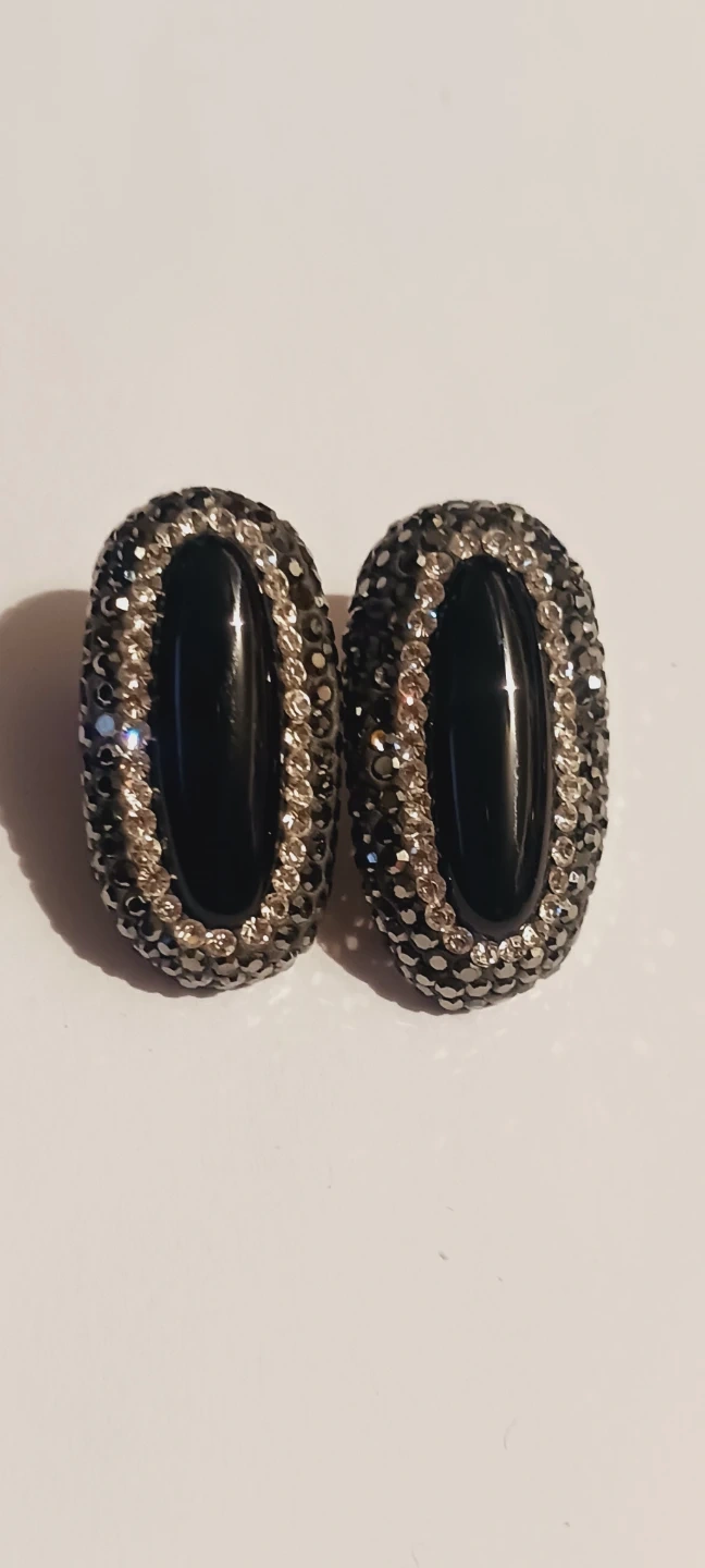 Showcasing a pair of Sterling silver 925 stampedoval clip-on earrings. Each earring features a smooth black stone surrounded by sparkling crystals. These earrings offer a classic look with a touch of glamour!!!