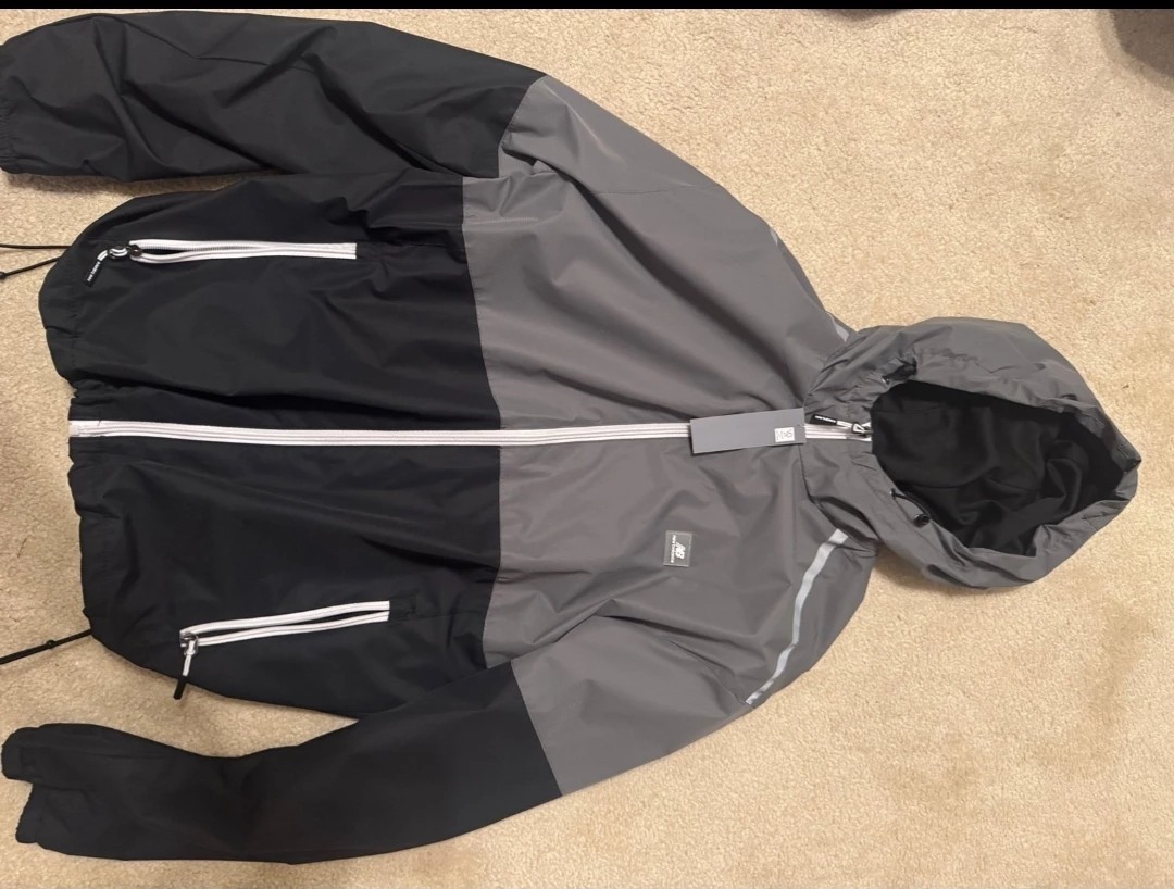 This New Balance windbreaker is a colorblock design in black and gray. It features a hood and zippered pockets. Made with lightweight material, it's perfect for layering during transitional weather. It's a versatile jacket for everyday wear.