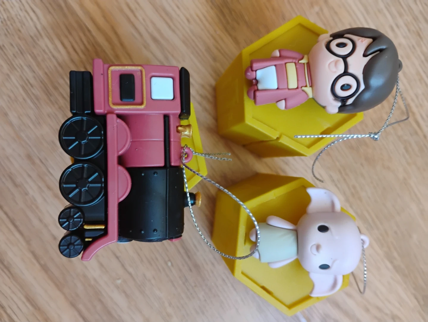Set includes a Hogwarts Express train and character ornaments of Harry Potter and Dobby. These ornaments are made of plastic and feature metallic hanging strings. Perfect for decorating a tree or for Harry Potter fans!