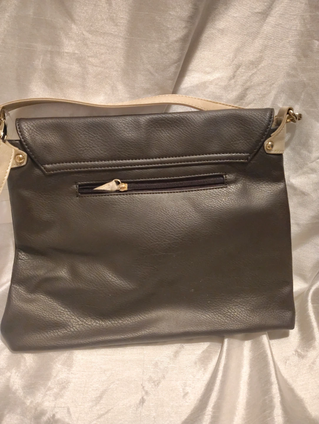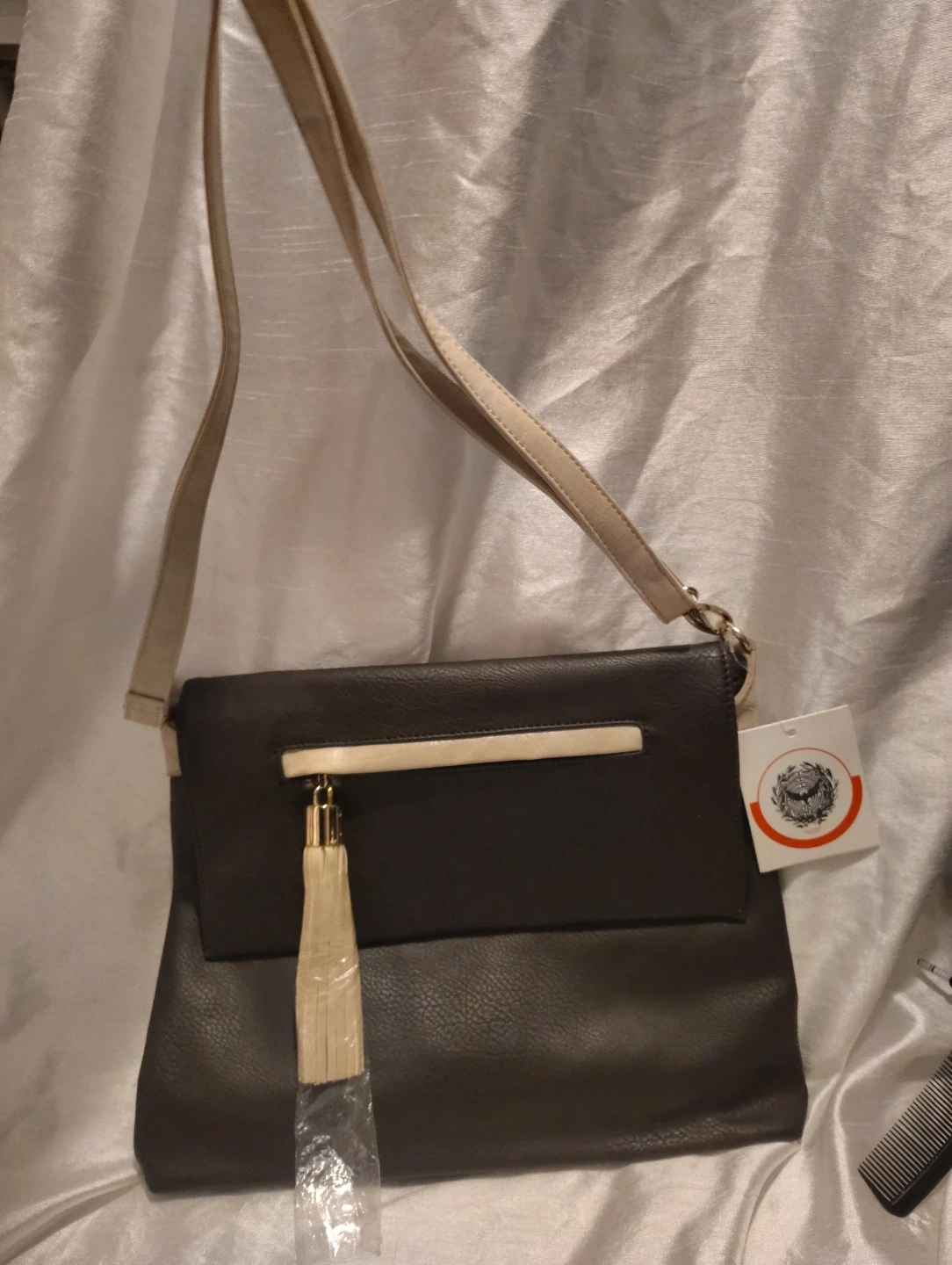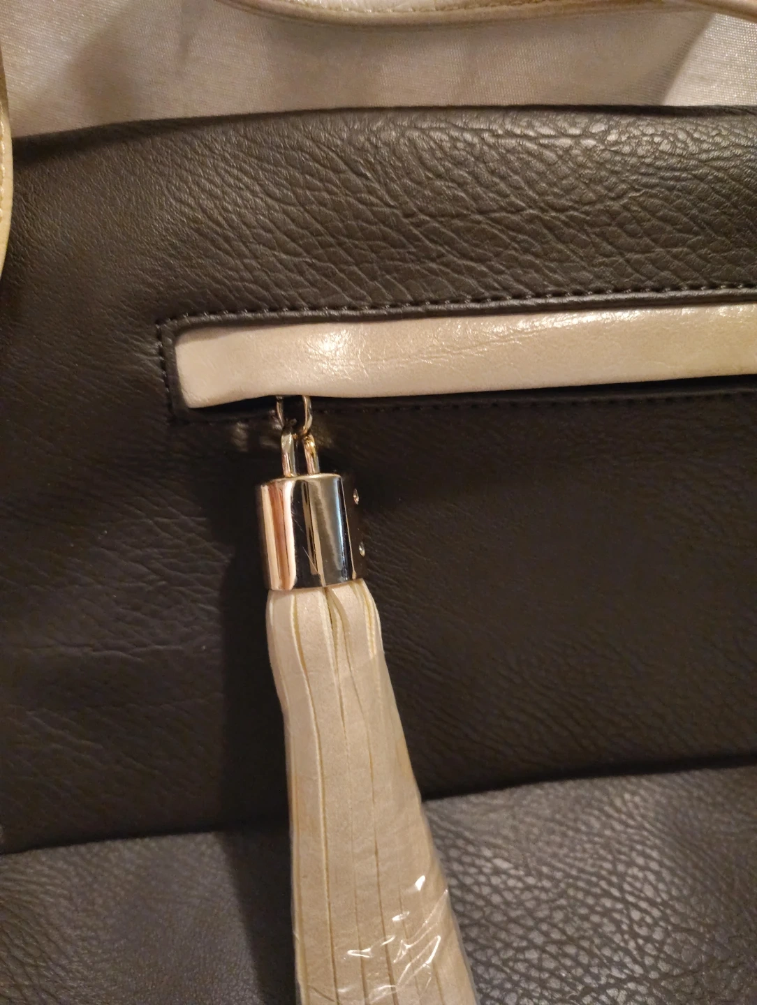 This clutch purse is made of brown faux leather. It features a zip pocket on the back and a magnetic snap closure inside. A decorative tassel hangs from the front detail. Comes with a detachable strap.
