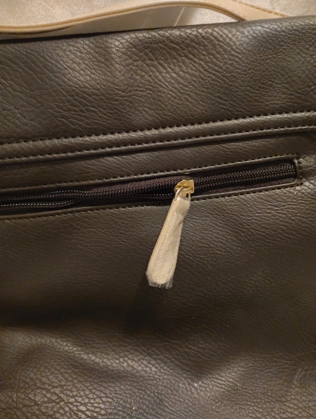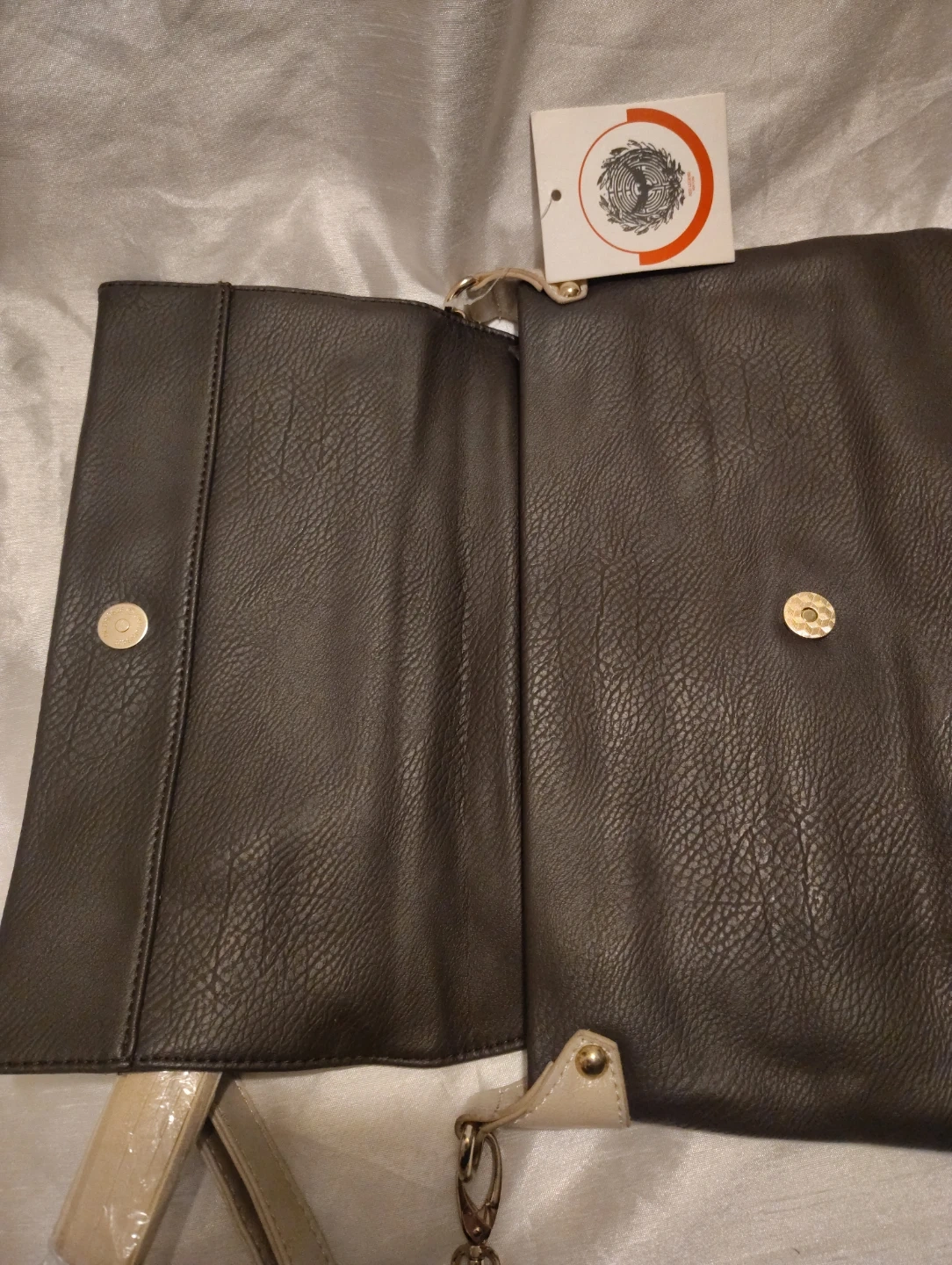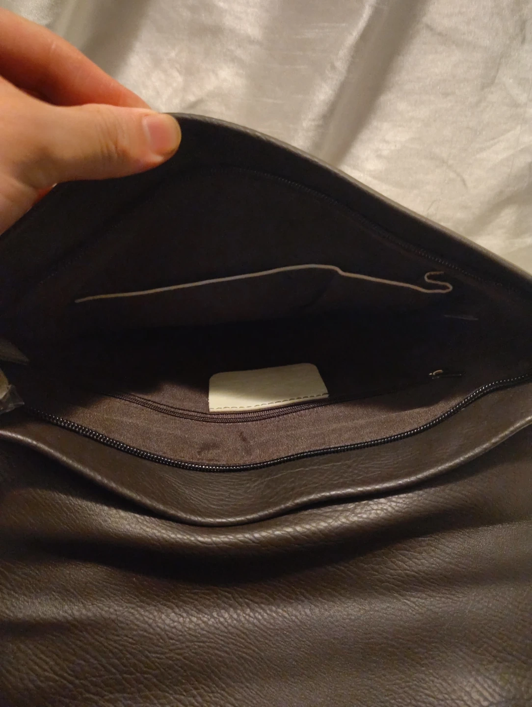 This clutch purse is made of brown faux leather. It features a zip pocket on the back and a magnetic snap closure inside. A decorative tassel hangs from the front detail. Comes with a detachable strap.