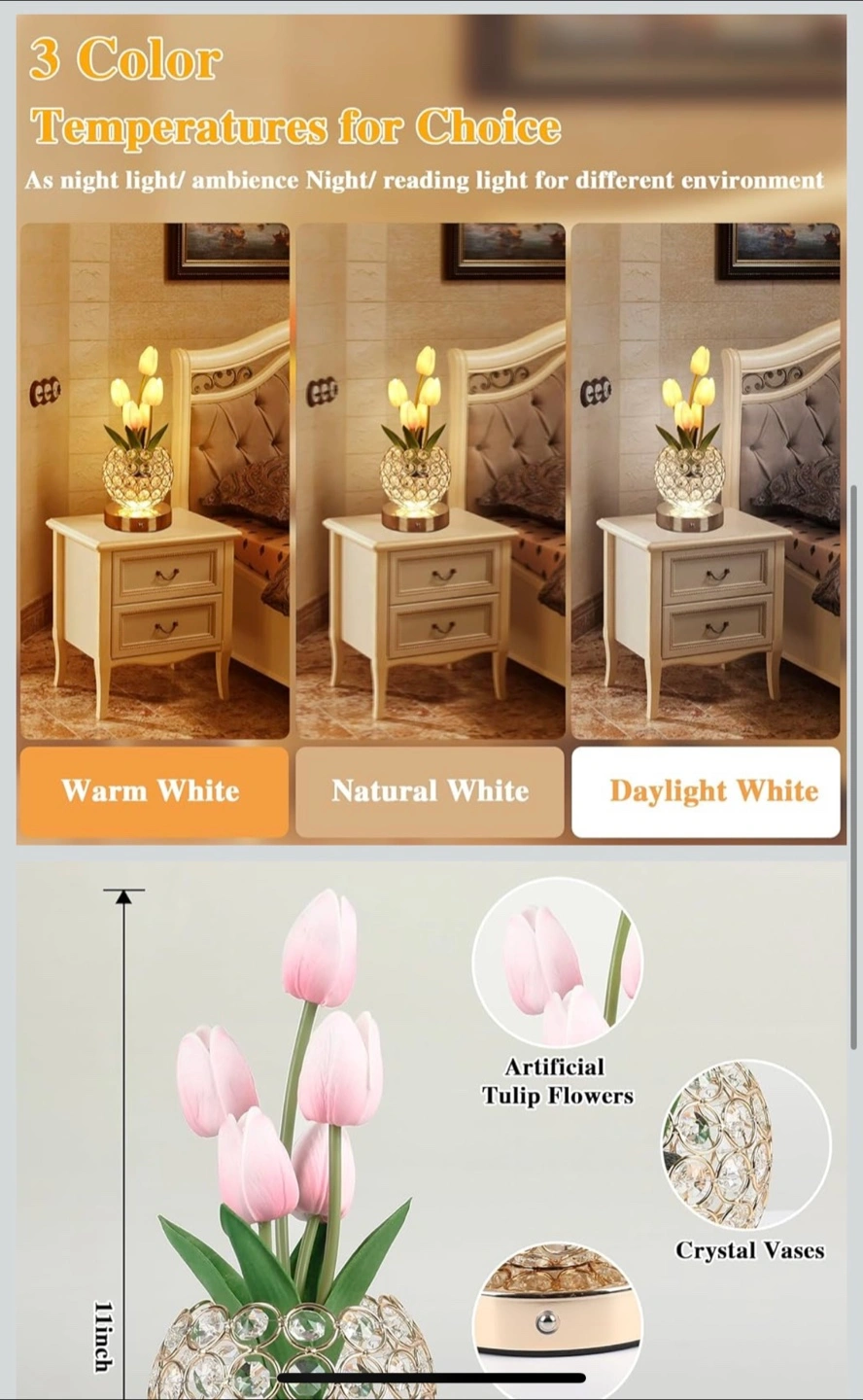 This beautiful crystal tulip table lamp offers three color temperatures: warm white, natural white, and daylight white! It can be used as a night light, ambience light, or reading light for different environments. It also functions as an essential oil diffuser