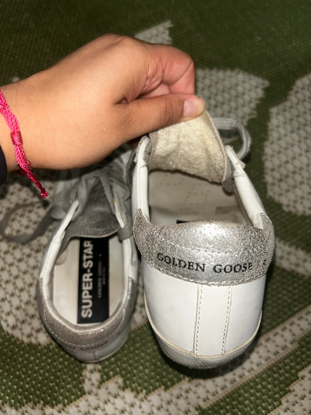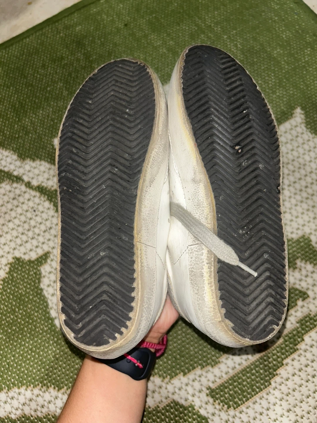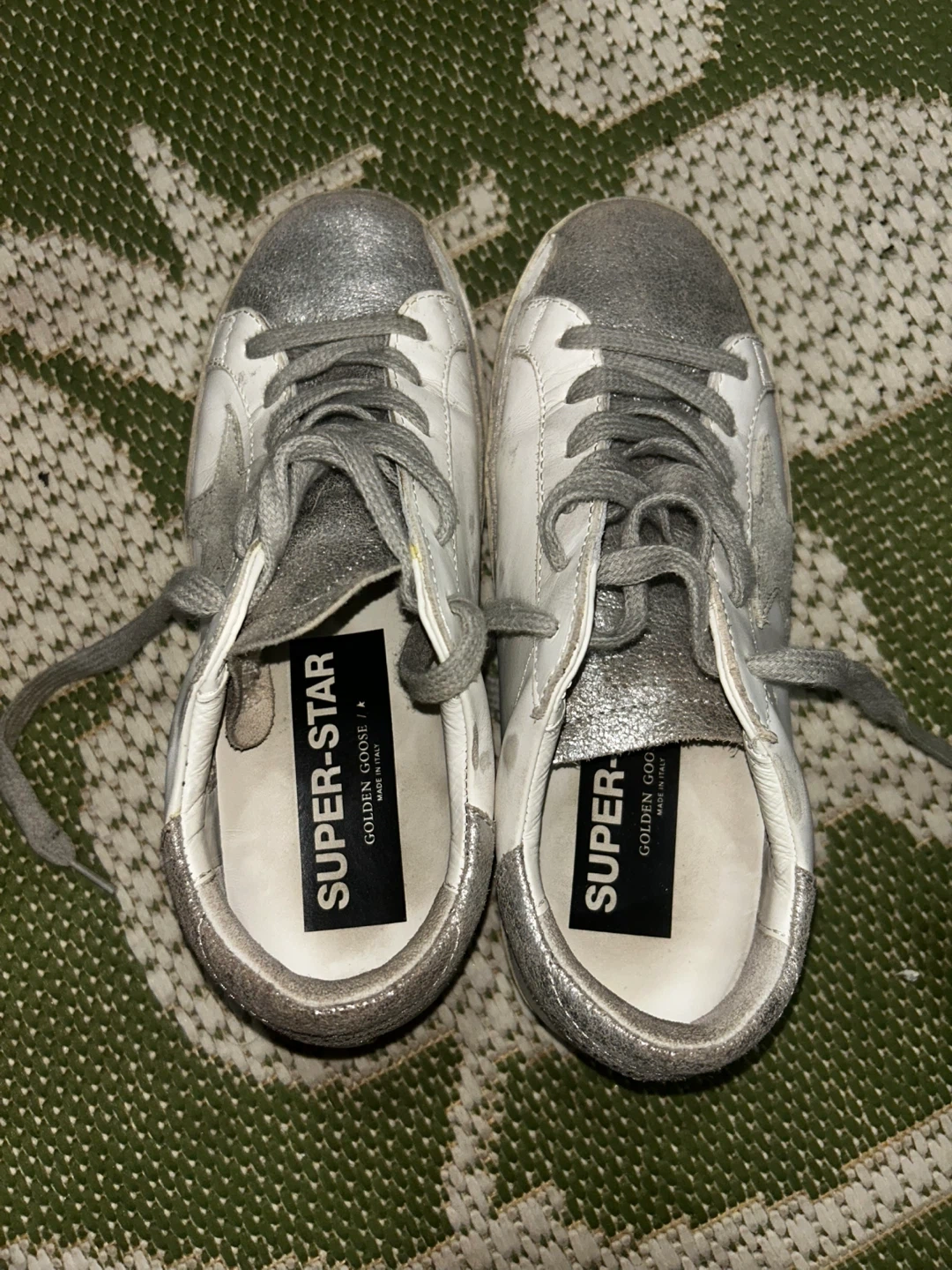 Selling a pair of Golden Goose Superstar sneakers! They have a white and silver color scheme and show some signs of wear, as pictured. These stylish sneakers are made in Italy and feature the iconic star patch. Perfect for adding a touch of edgy style to your wardrobe