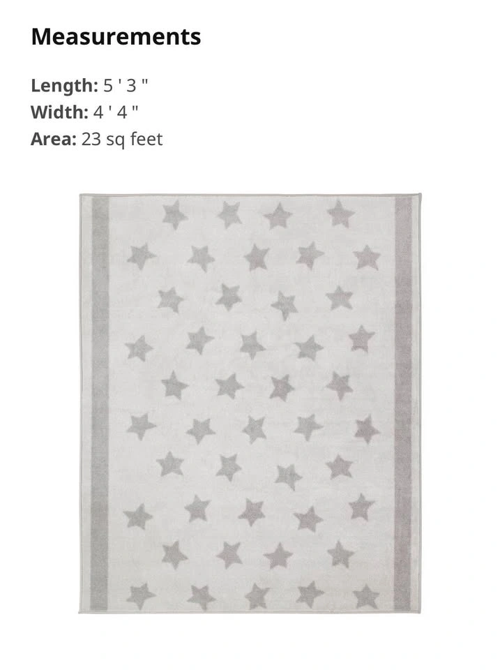 NEW condition. Opened the bag but never unrolled or used — resealed after changing my mind, so it’s essentially brand new. Discontinued model from IKEA, making it harder to find. Details: ✅ Color: Grey ✅ Rubber-backed, stays in place without slipping ✅ Machine washable for easy cleaning ✅ Soft, cozy texture — great for kids’ rooms, nurseries, or play areas ✅ Measurements: Length 5'3" × Width 4'4" (Area: 23 sq ft) This rug is no longer sold at IKEA, so it’s a good chance to grab a discontinued style that’s practical and easy to care for.