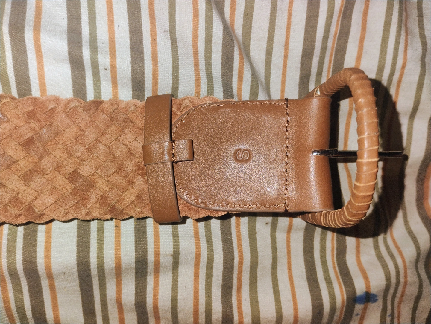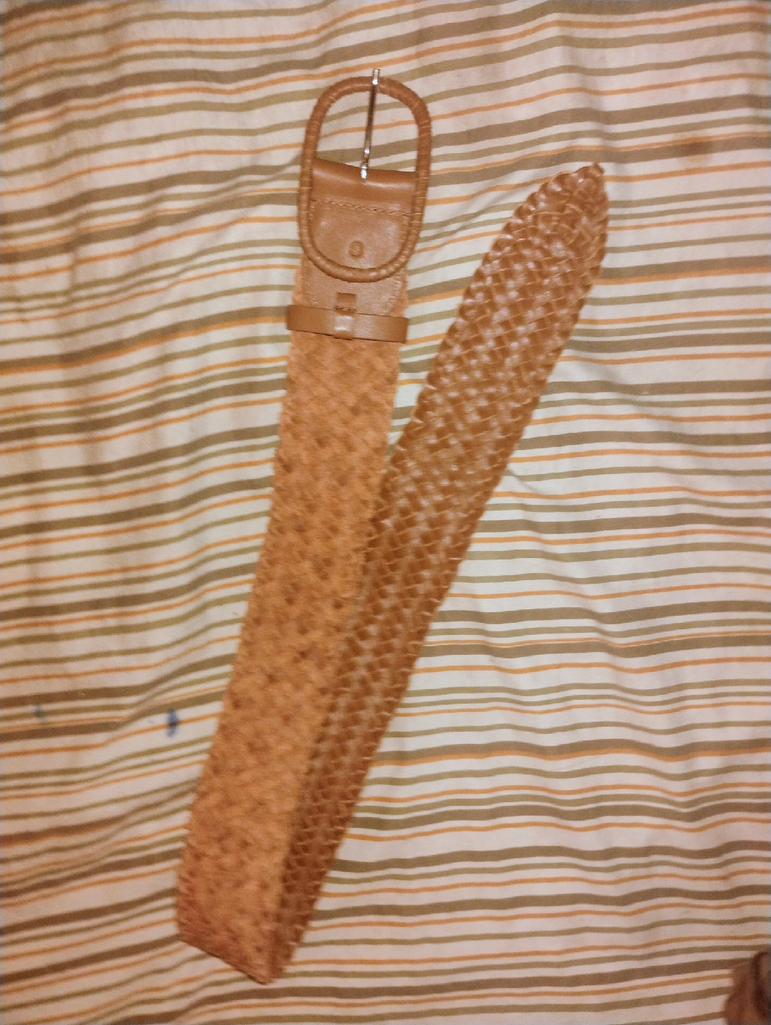 129Selling a tan woven belt. It’s in great condition and ready for a new home! The material is leather-like and the buckle is a rounded shape.