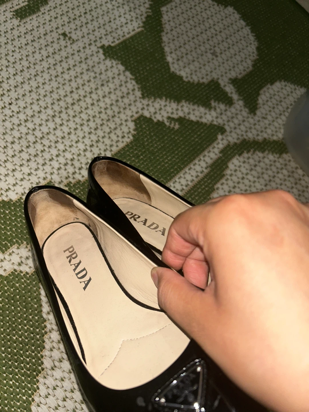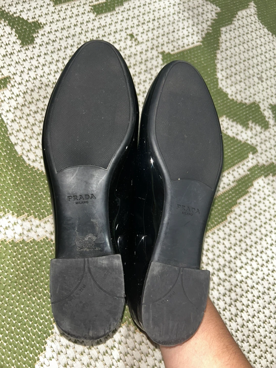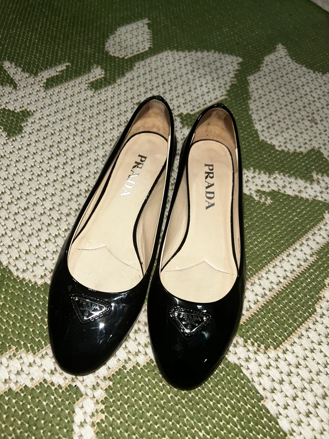 Selling a pair of Prada ballet flats in black patent leather. They have the Prada logo on the front. These flats are in used condition, as shown in the pictures.