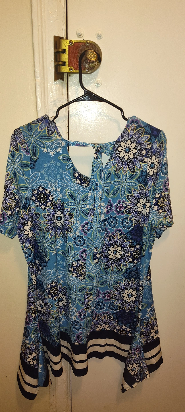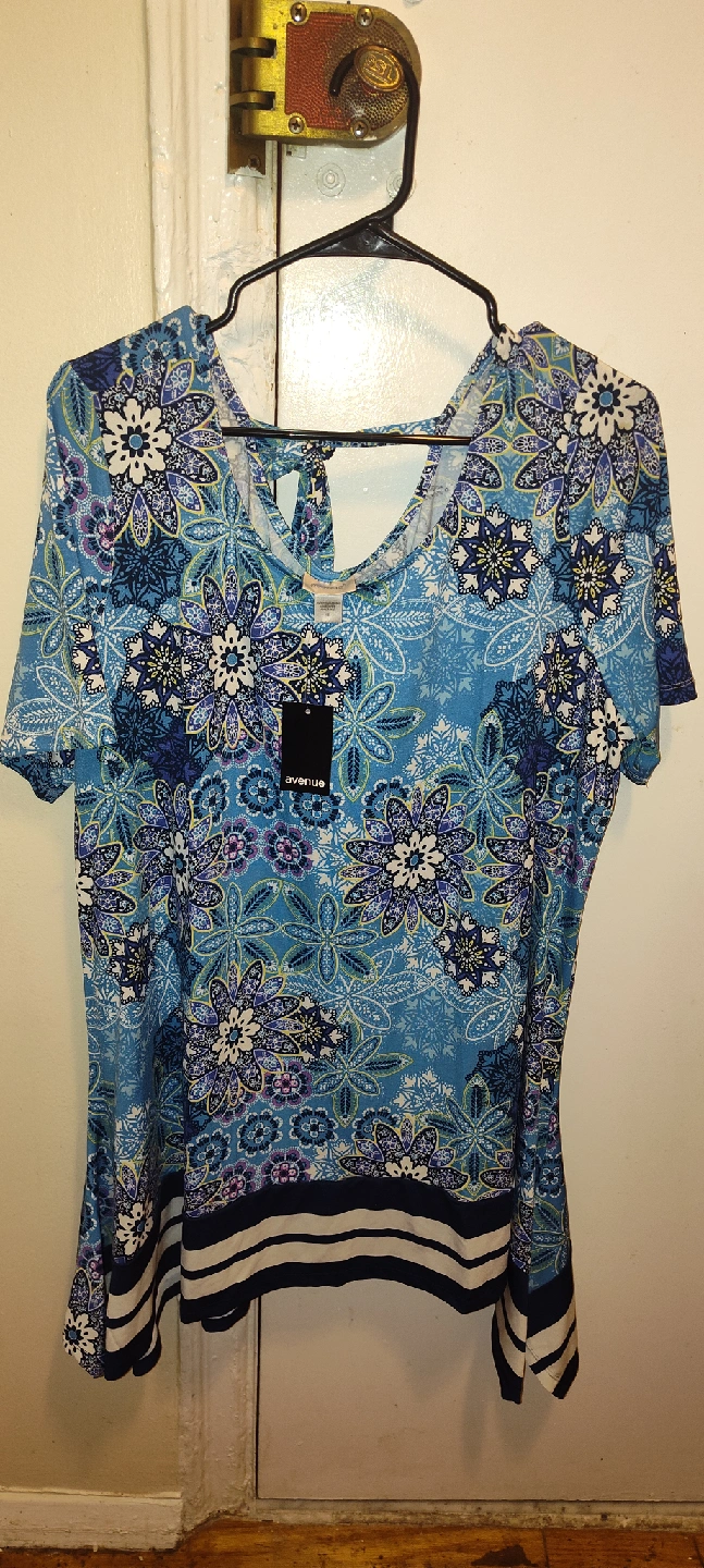 135This is a cute Avenue top with a blue floral print. It's a size 18 and has a unique tie detail in the back. Perfect for a casual day out!