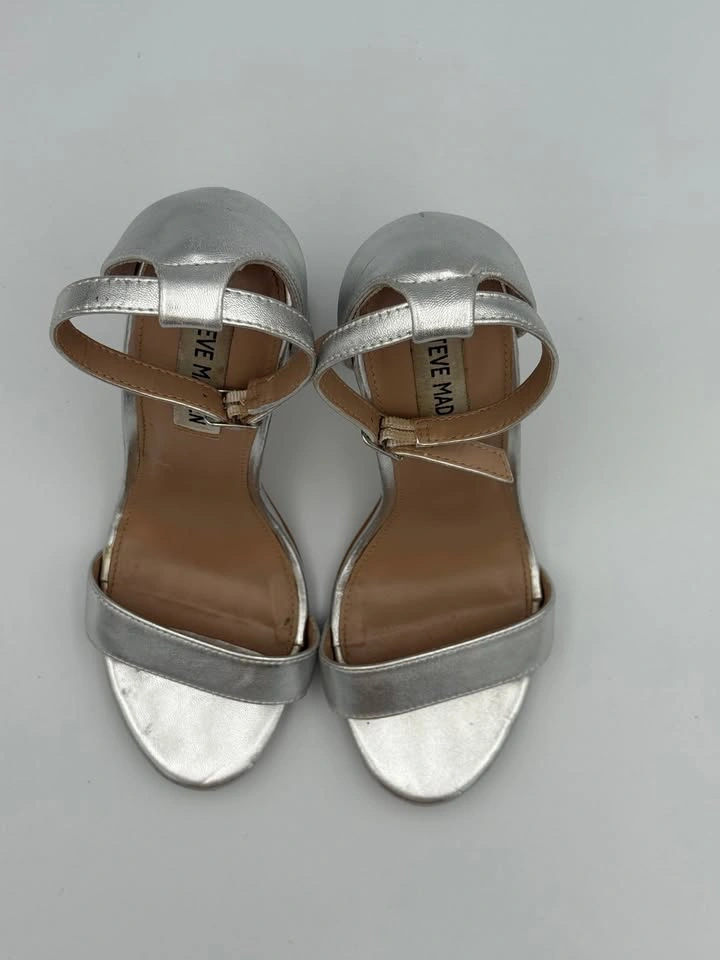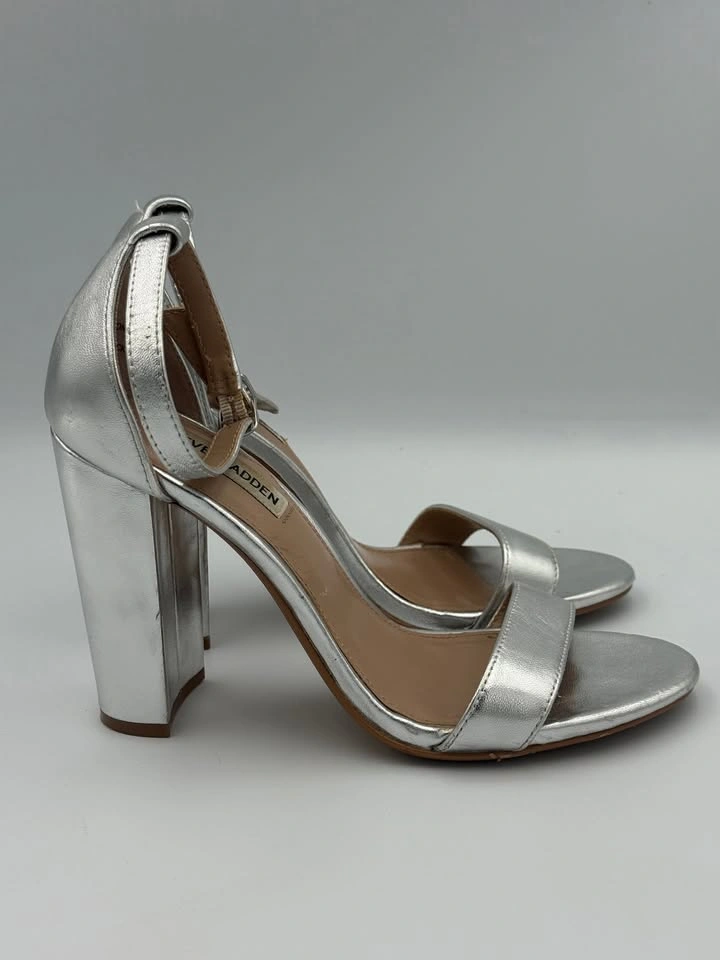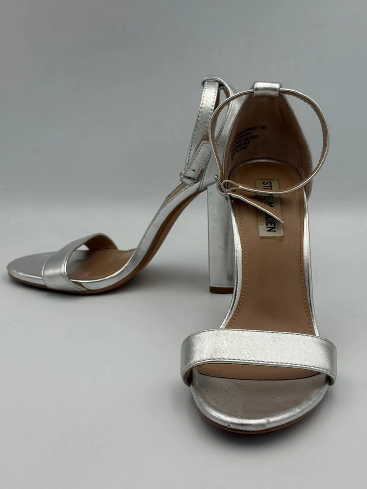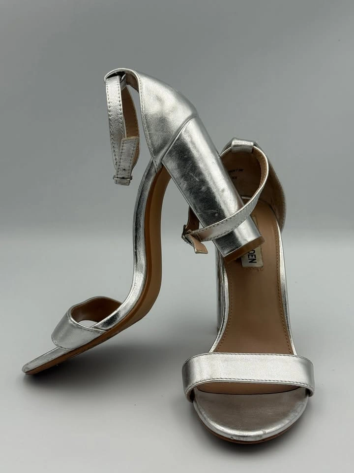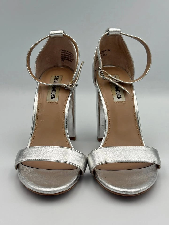 Step into timeless style with these elegant Steve Madden Metallic Silver Strappy Heels in Women’s Size 7.5. Perfect for weddings, proms, parties, or a night out, these heels bring shine and sophistication to any outfit. Brand: Steve Madden Color: Metallic Silver Size: 7.5 (Medium Width) Style: Strappy Dress Heels Condition: Pre-owned, in Excellent Condition with minor signs of wear. Clean, sturdy, and ready to wear. ✨ Metallic silver finish for a chic, modern look ✨ Comfortable fit – ideal for long wear ✨ Versatile design that pairs beautifully with formal and evening outfits These Steve Madden metallic silver heels are a must-have for your special occasions—don’t miss out on this stylish deal!