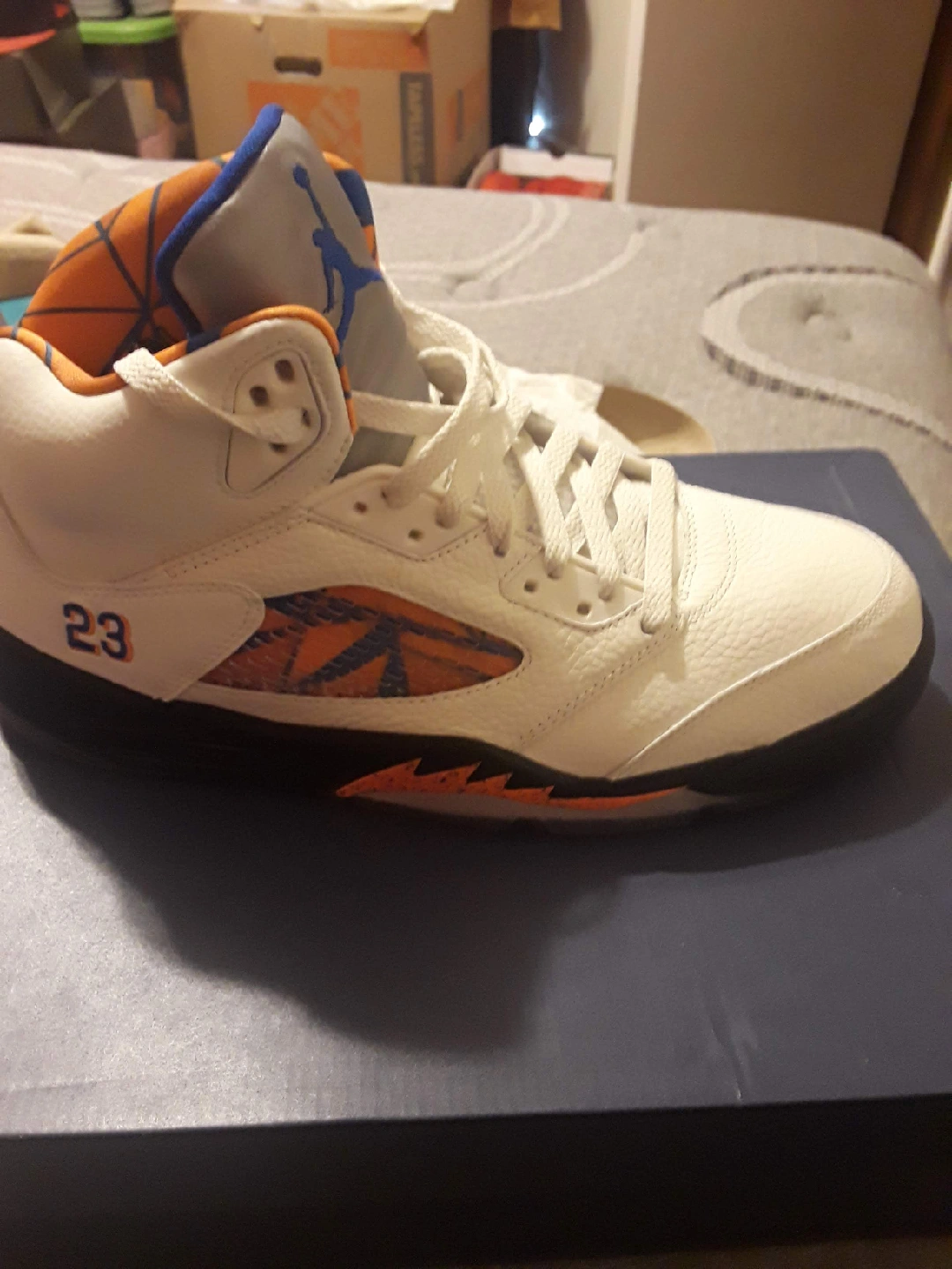 Selling a pair of Air Jordan 5 International shoes! These are in great condition and come with the original box. The shoes feature a unique design with orange and blue accents, and the number 23 on the side. Perfect for any Jordan fan!