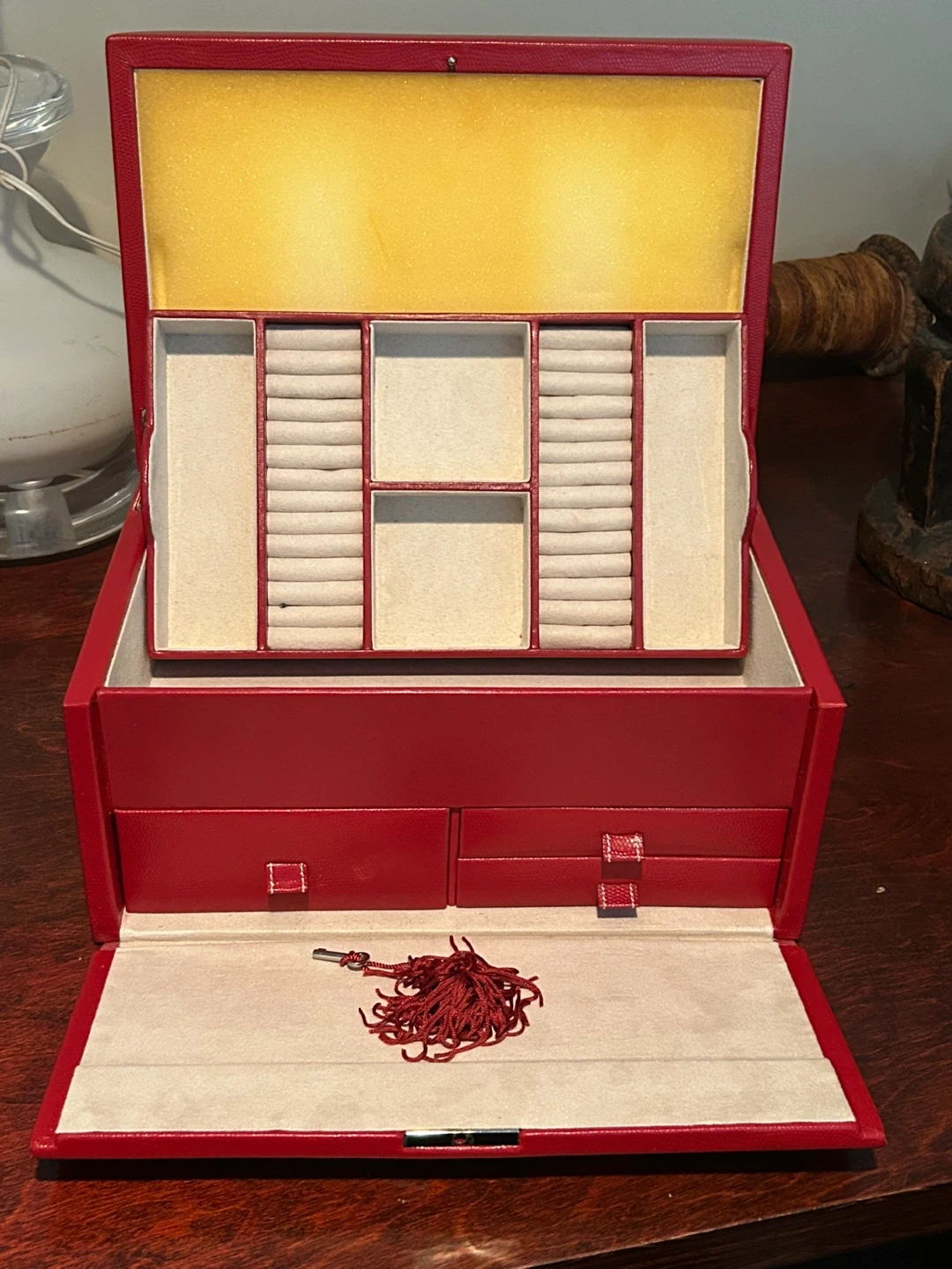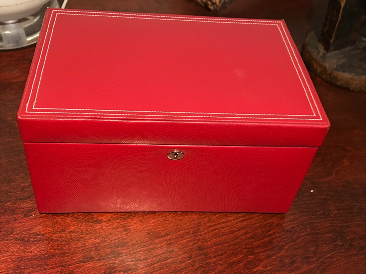 Here's a red jewelry box with a lock and key. It has several compartments for organizing your jewelry. The box is in good condition and ready for a new home!